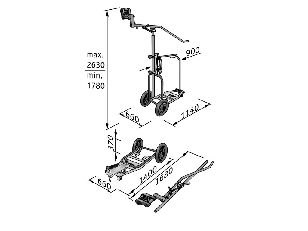 - Beznástrojové sestavení a rozebrání pomocí rychloupínacích prvků. Podvozek má robustní sklápěcí mechanismus uzpůsobený pro jednoduchou přepravu
