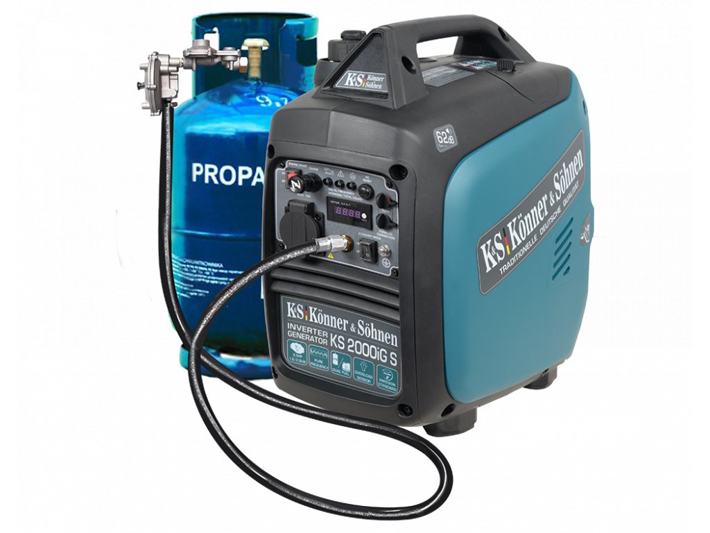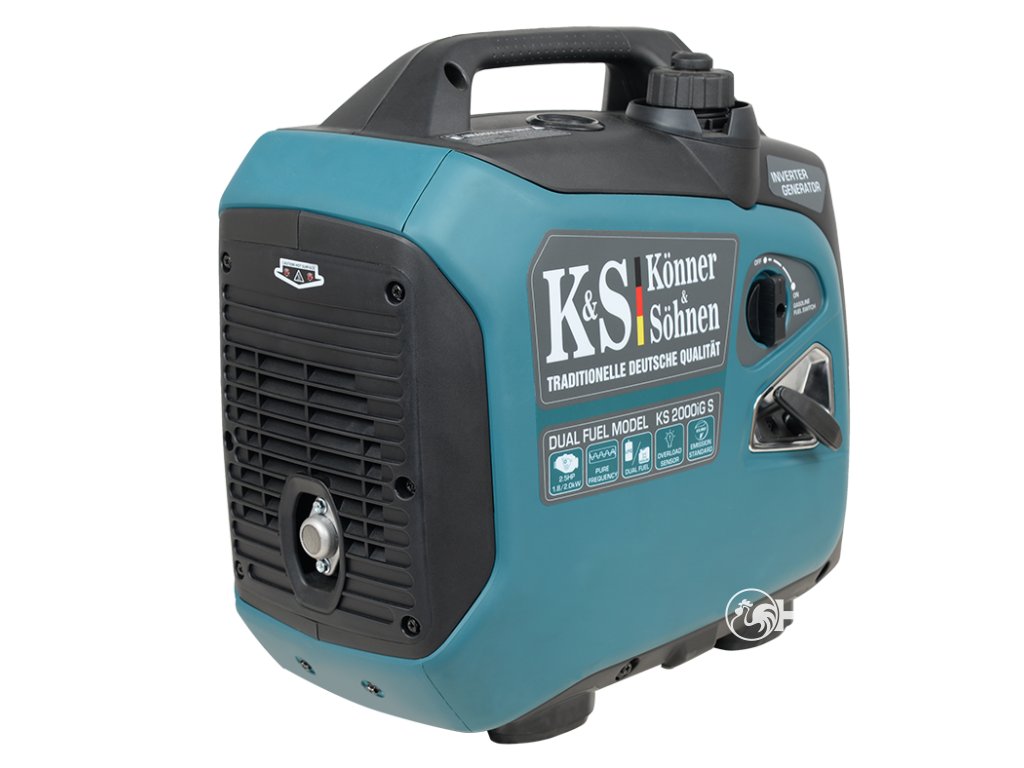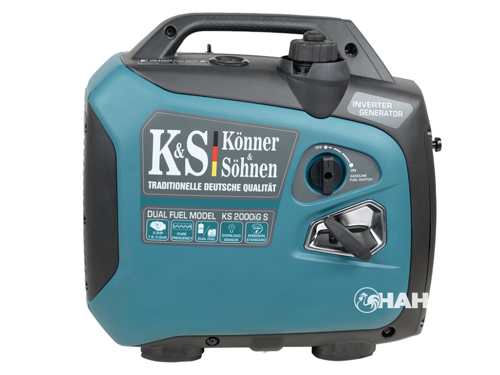 Invertorová elektrocentrála na plyn a benzín Könner & Söhnen KS 2000iG S německé značky Könner & Söhnen je pohodlný, kompaktní, téměř tichý zdroj elektrické energie. Klíčovou vlastností tohoto modelu je, že produkuje elektrický proud se správnou sinusovou vlnou.