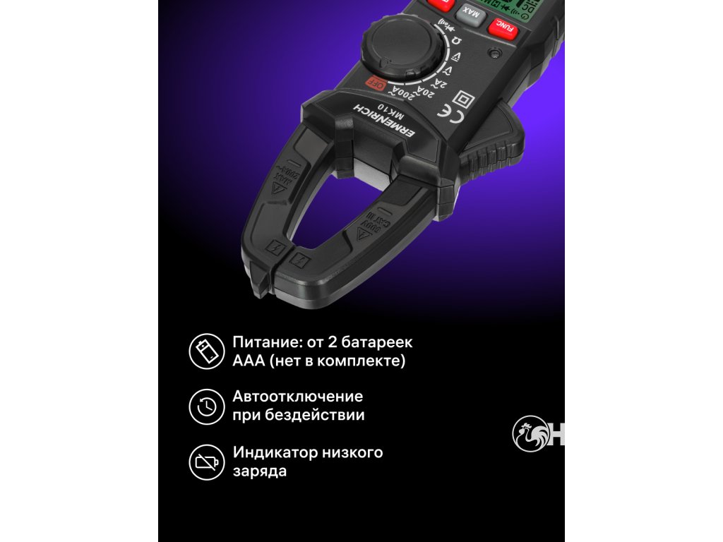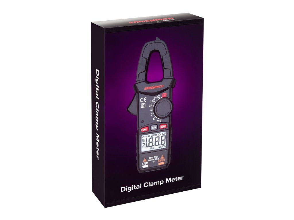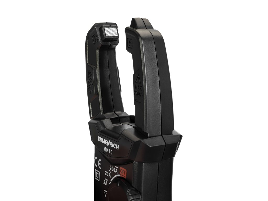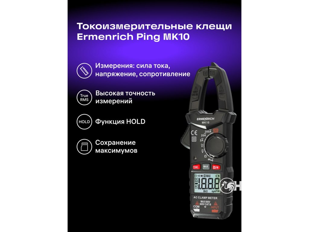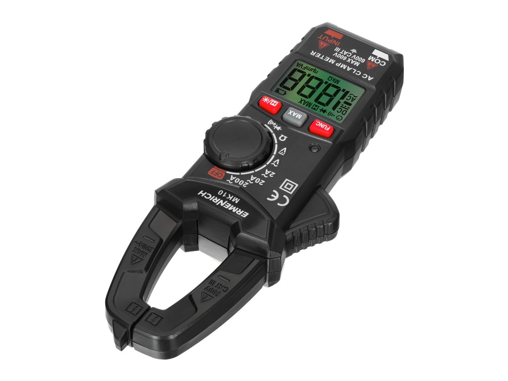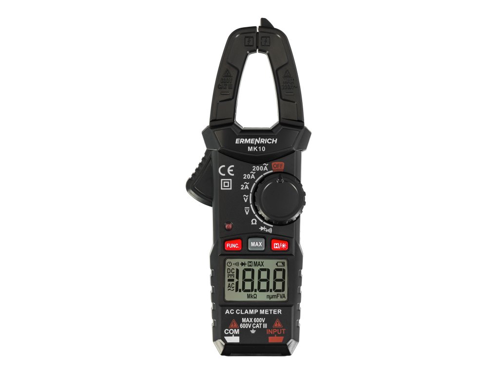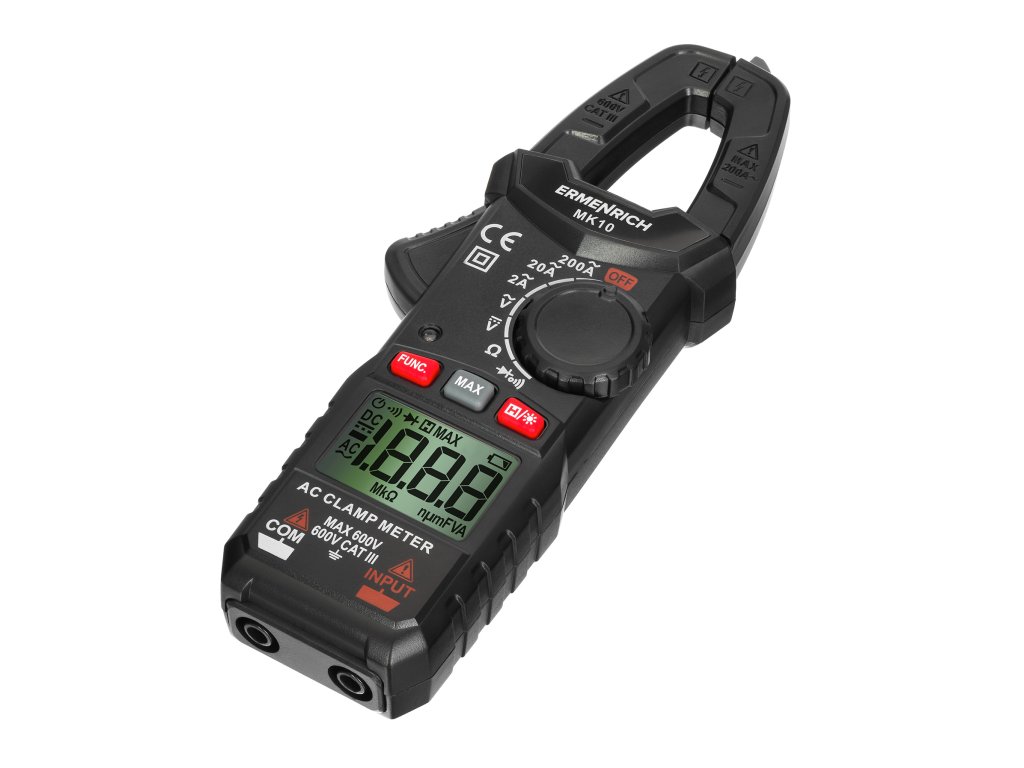 Klešťový měřič Ermenrich Ping MK10 je přenosný měřicí přístroj, který k měření proudu nevyžaduje přerušení obvodu a zajišťuje tak bezpečnou práci s elektrickými sítěmi a elektrickými zařízeními. Digitální klešťový měřič je nepostradatelný v případech, kdy není možné vypnout elektrický proud, a je vhodný pro použití při měření na těžko přístupných místech.Přístroj kombinuje funkce voltmetru (měření stejnosměrného a střídavého napětí), ampérmetru (měření střídavého proudu) a ohmmetru (měření odporu). Výpočty se provádějí pomocí skutečné efektivní hodnoty (metoda True RMS), a proto je přesnost měření proměnných veličin vysoká. Mezi další funkce tohoto modelu patří test kontinuity obvodu a testování diod na závady.