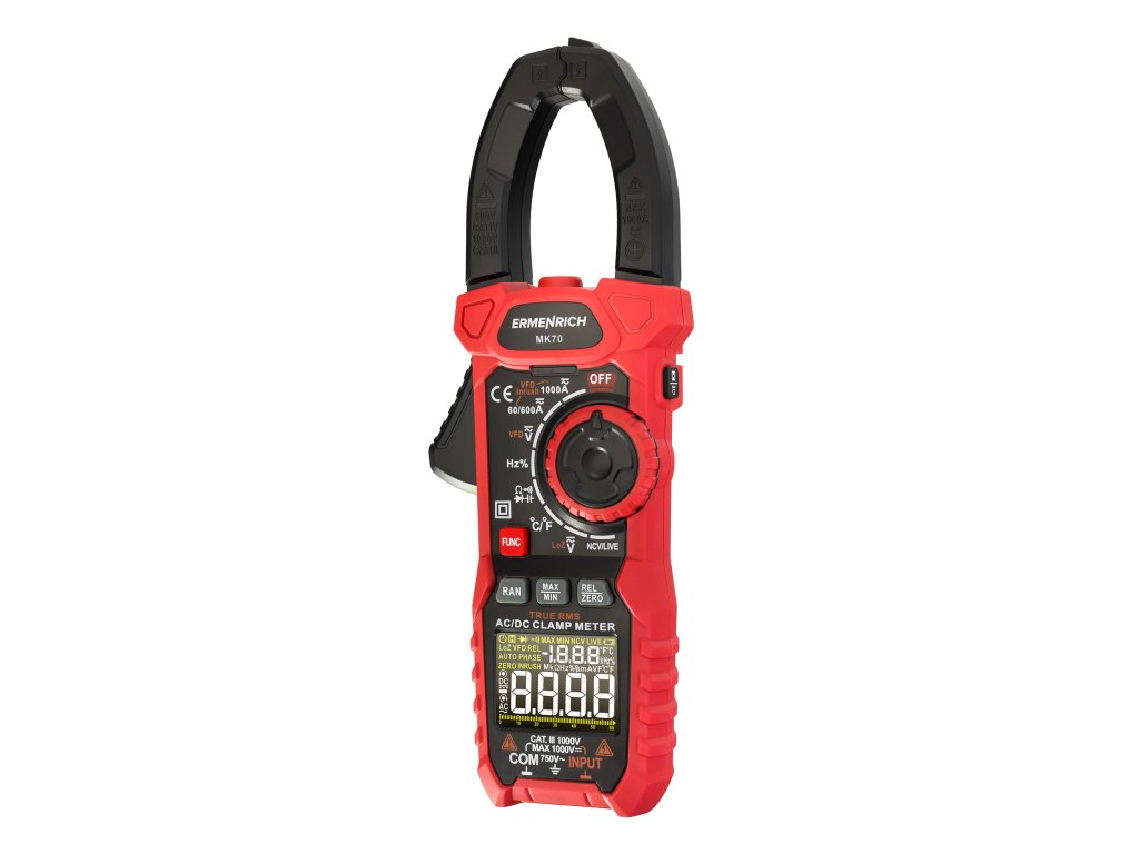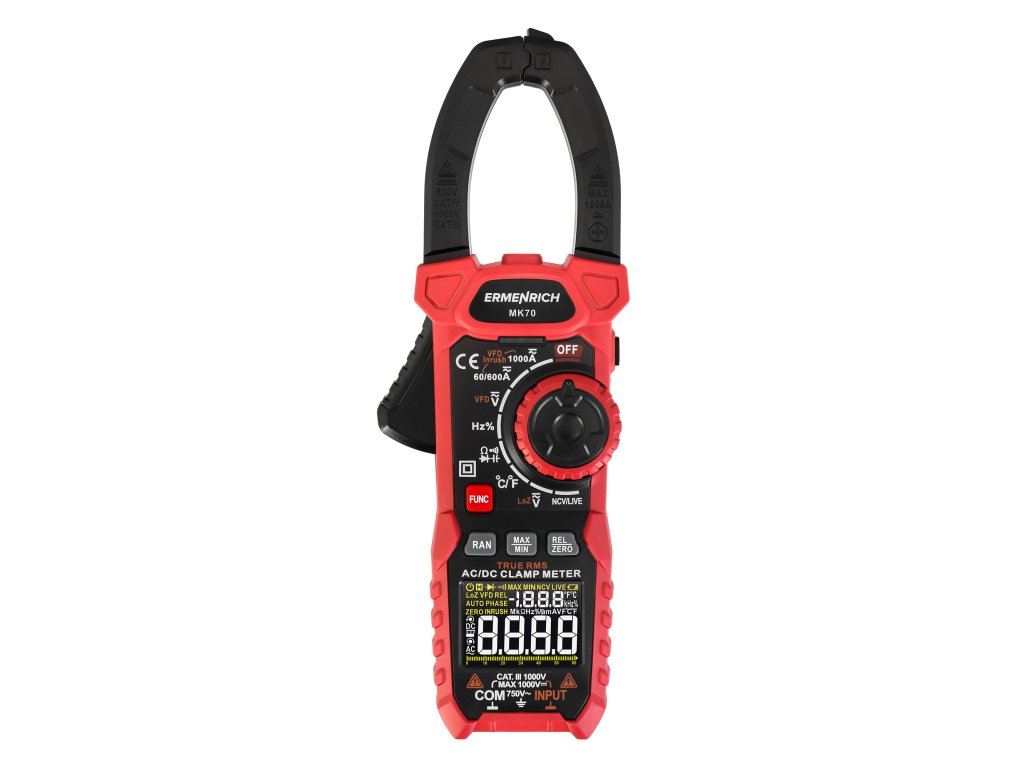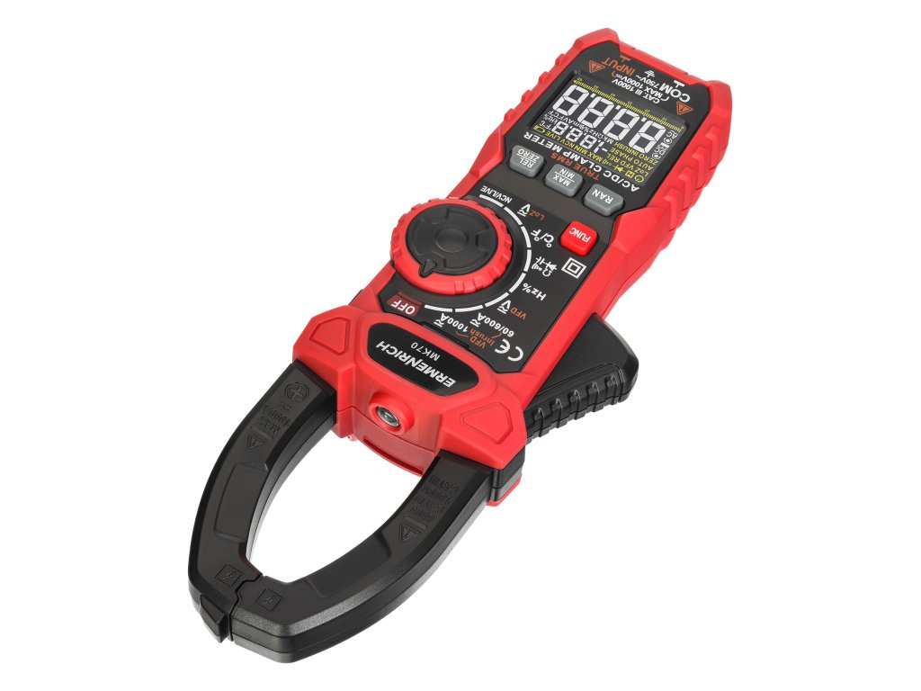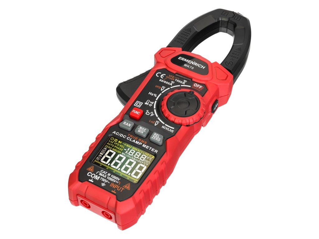 Ermenrich Ping MK70 je klešťový měřič s funkcí měření stejnosměrného proudu. Měří také střídavý proud a kombinuje funkce dalších 6 měřicích přístrojů: ohmmetru, voltmetru, měřiče frekvence, měřiče kapacity, měřiče pracovního cyklu a teplotního snímače na bázi termočlánku. Vysoká spolehlivost měření je zaručena výpočtem založeným na skutečné střední kvadratické hodnotě (True RMS). Široká funkčnost pokrývá potřeby nejen amatérských, ale i profesionálních elektrikářů.Digitální klešťový měřič se používá také k diagnostice elektrických sítí při hledání přerušených obvodů a zkratů, k testování diod na přítomnost závad a k detekci skrytých kabelů (funkce NCV). Tento model má také pokročilé funkce: měření rozběhového proudu, frekvenční měnič, režim nízké impedance (měření napětí při nízké vstupní impedanci), nastavení nuly při měření DC proudu (funkce DCA Zero).