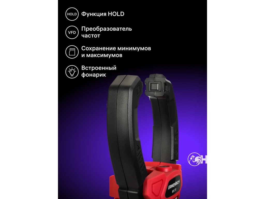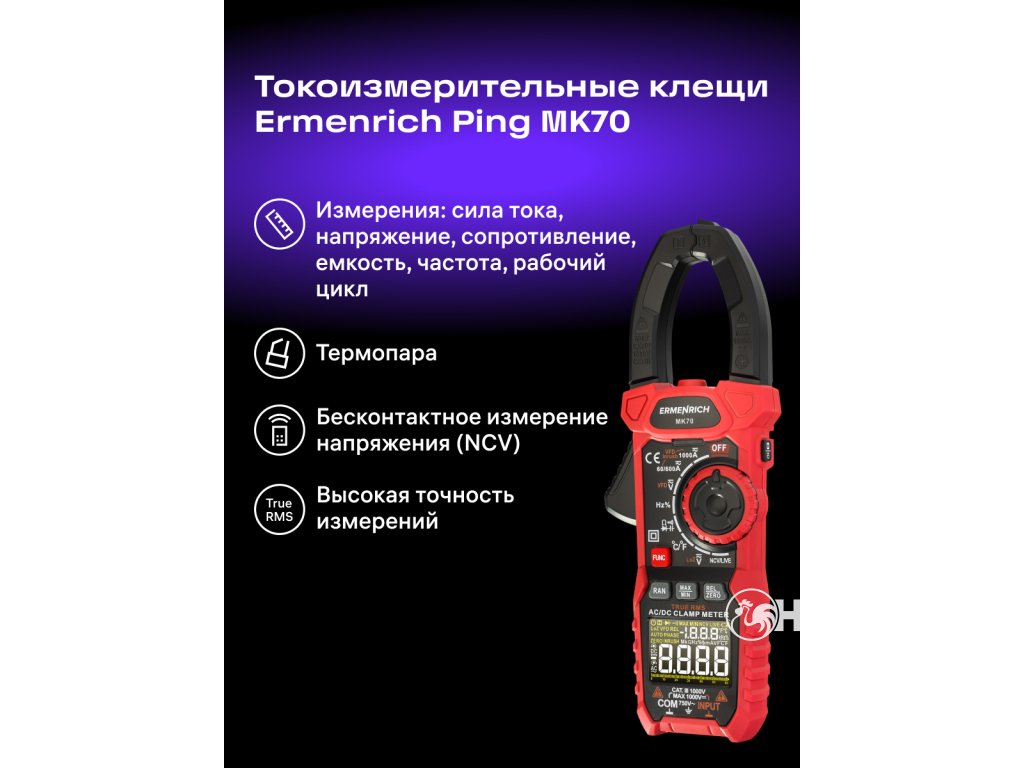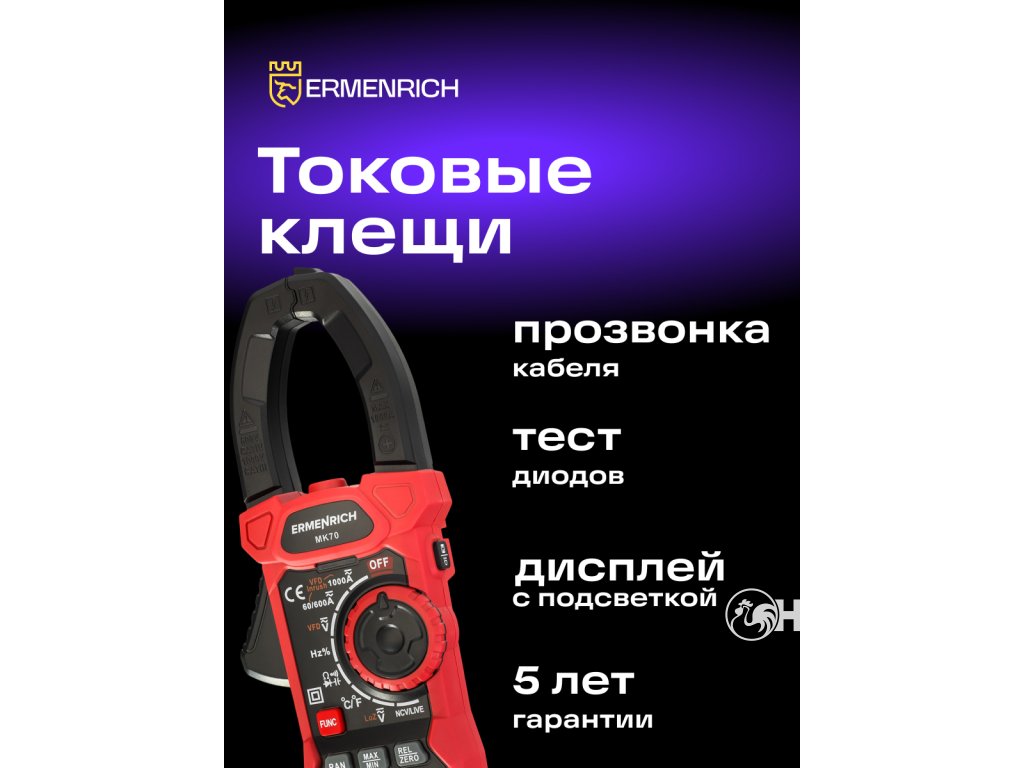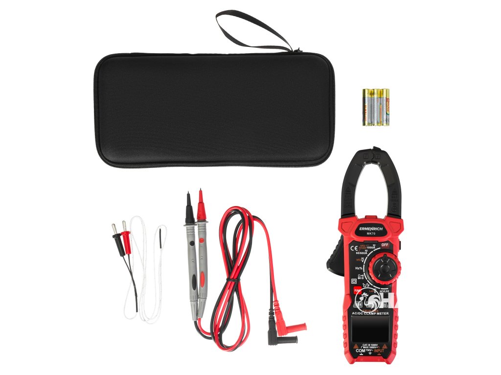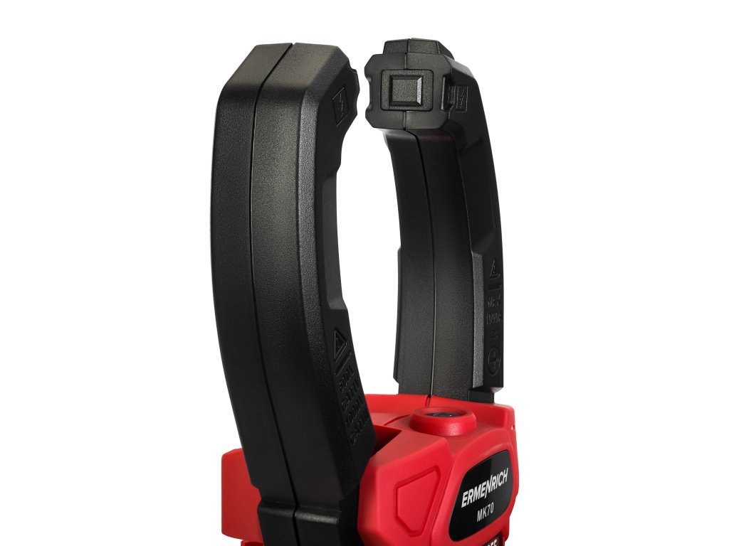 Ermenrich Ping MK70 je klešťový měřič s funkcí měření stejnosměrného proudu. Měří také střídavý proud a kombinuje funkce dalších 6 měřicích přístrojů: ohmmetru, voltmetru, měřiče frekvence, měřiče kapacity, měřiče pracovního cyklu a teplotního snímače na bázi termočlánku. Vysoká spolehlivost měření je zaručena výpočtem založeným na skutečné střední kvadratické hodnotě (True RMS). Široká funkčnost pokrývá potřeby nejen amatérských, ale i profesionálních elektrikářů.Digitální klešťový měřič se používá také k diagnostice elektrických sítí při hledání přerušených obvodů a zkratů, k testování diod na přítomnost závad a k detekci skrytých kabelů (funkce NCV). Tento model má také pokročilé funkce: měření rozběhového proudu, frekvenční měnič, režim nízké impedance (měření napětí při nízké vstupní impedanci), nastavení nuly při měření DC proudu (funkce DCA Zero).