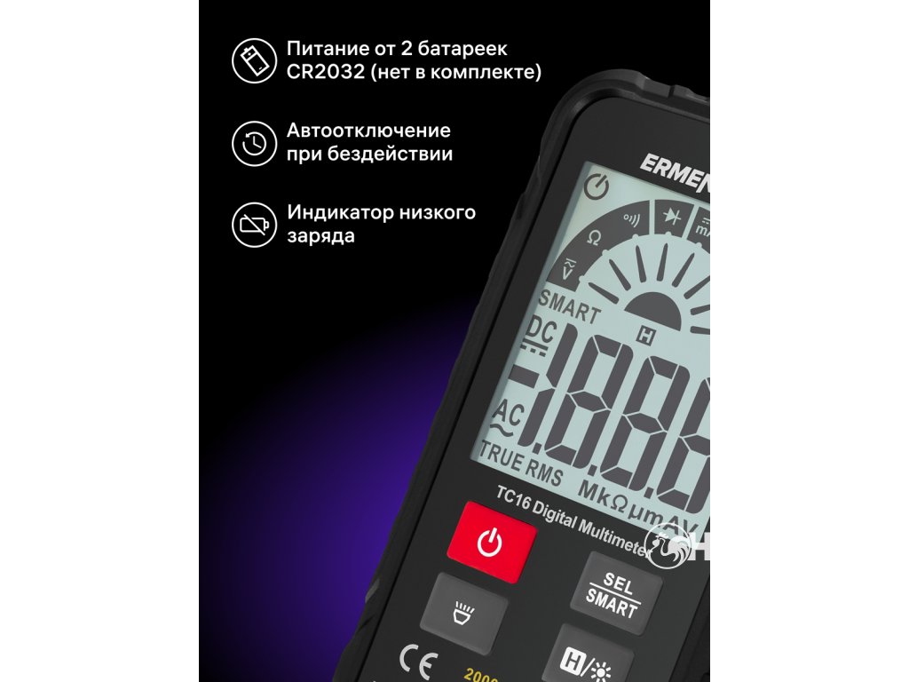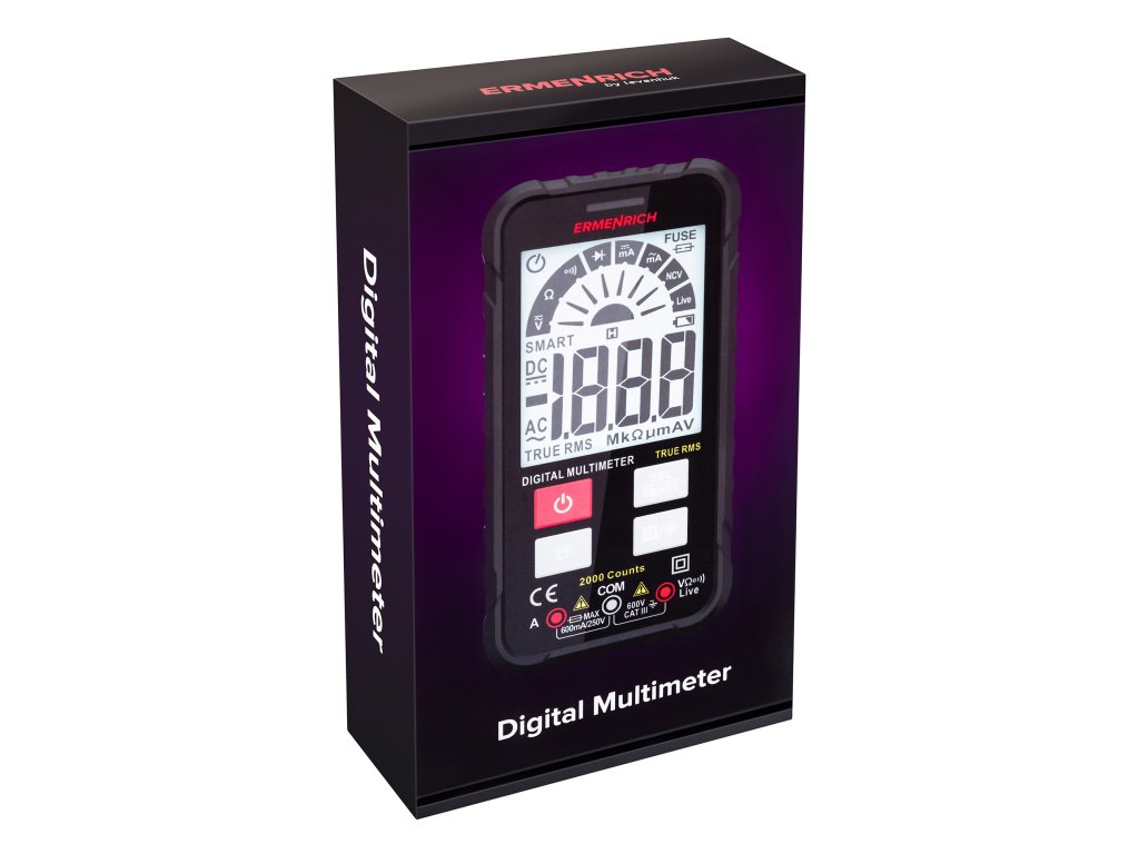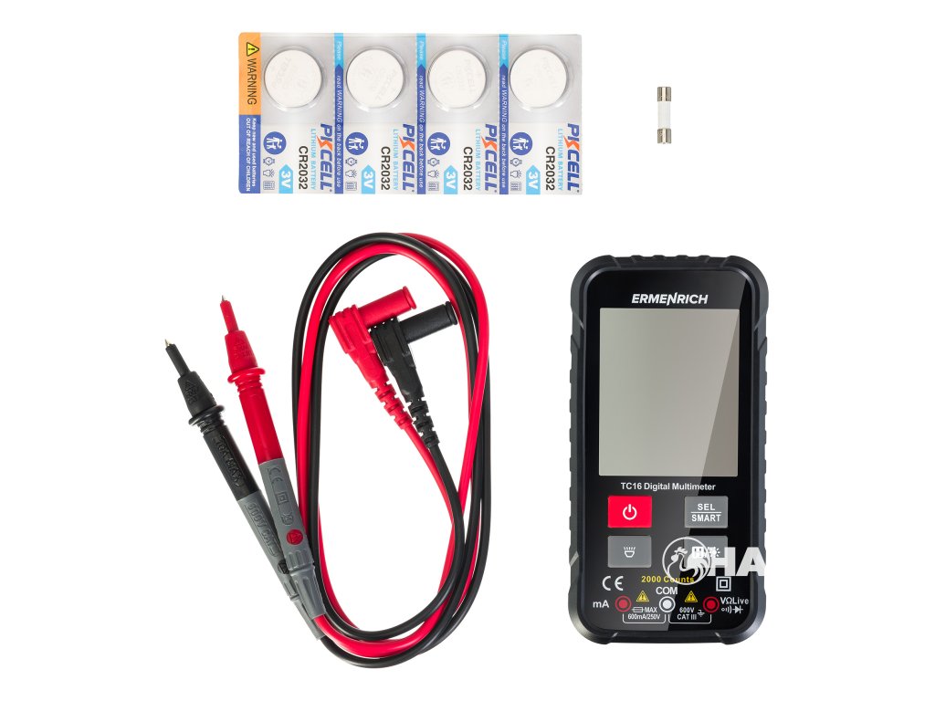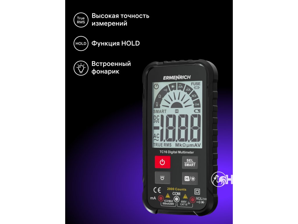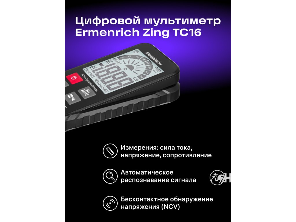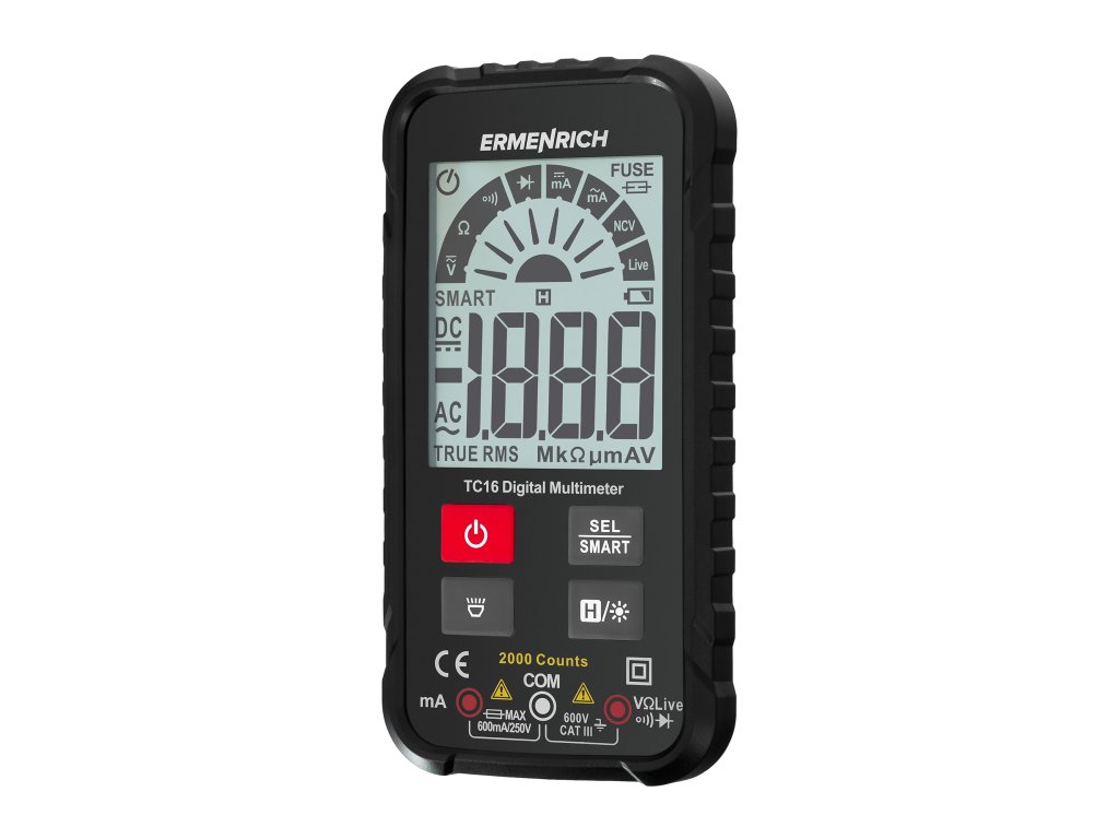 Ermenrich Zing TC16 je kompaktní digitální multimetr s funkcemi pro základní testování elektrických sítí. Přístroj se snadno ovládá, poskytuje přesná měření a má funkci Smart (automaticky rozpozná typ příchozího signálu a změří jeho jednotlivé parametry). K dispozici je také možnost ruční volby provozního režimu.