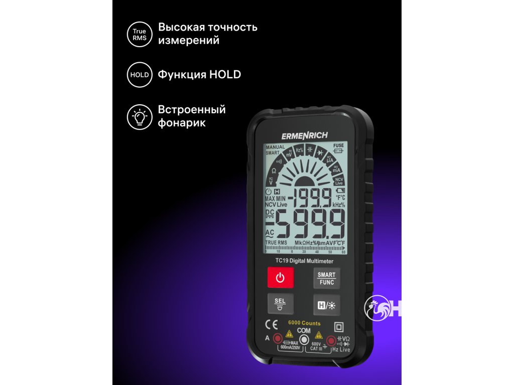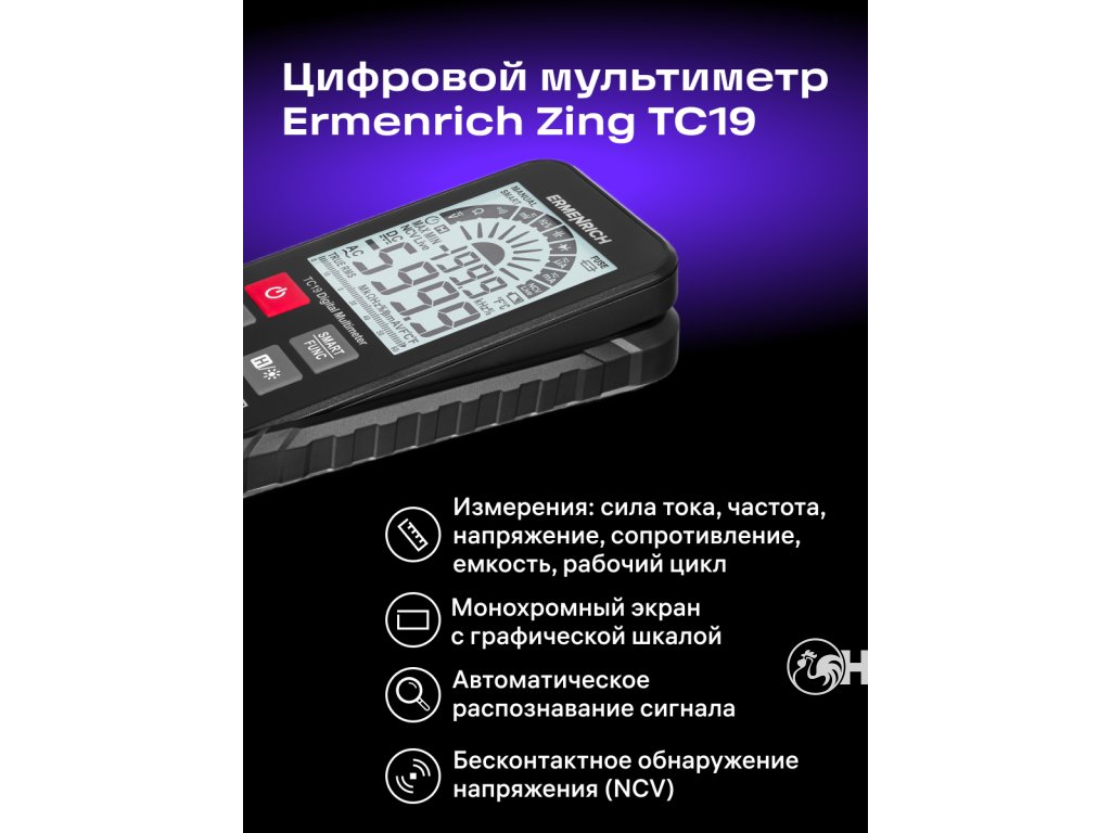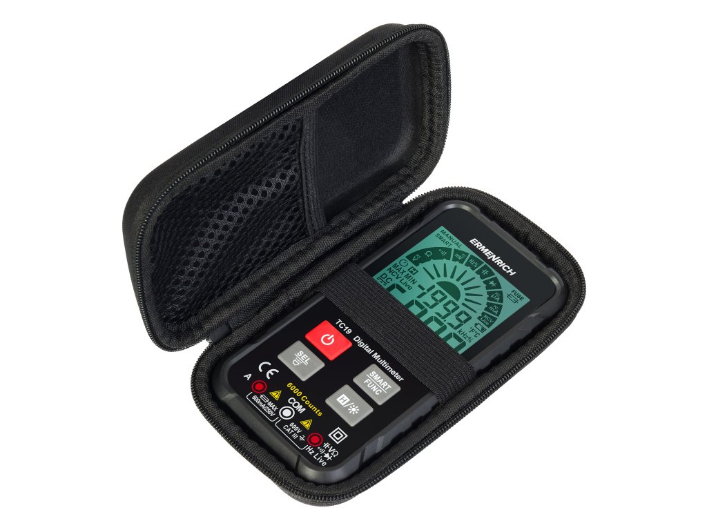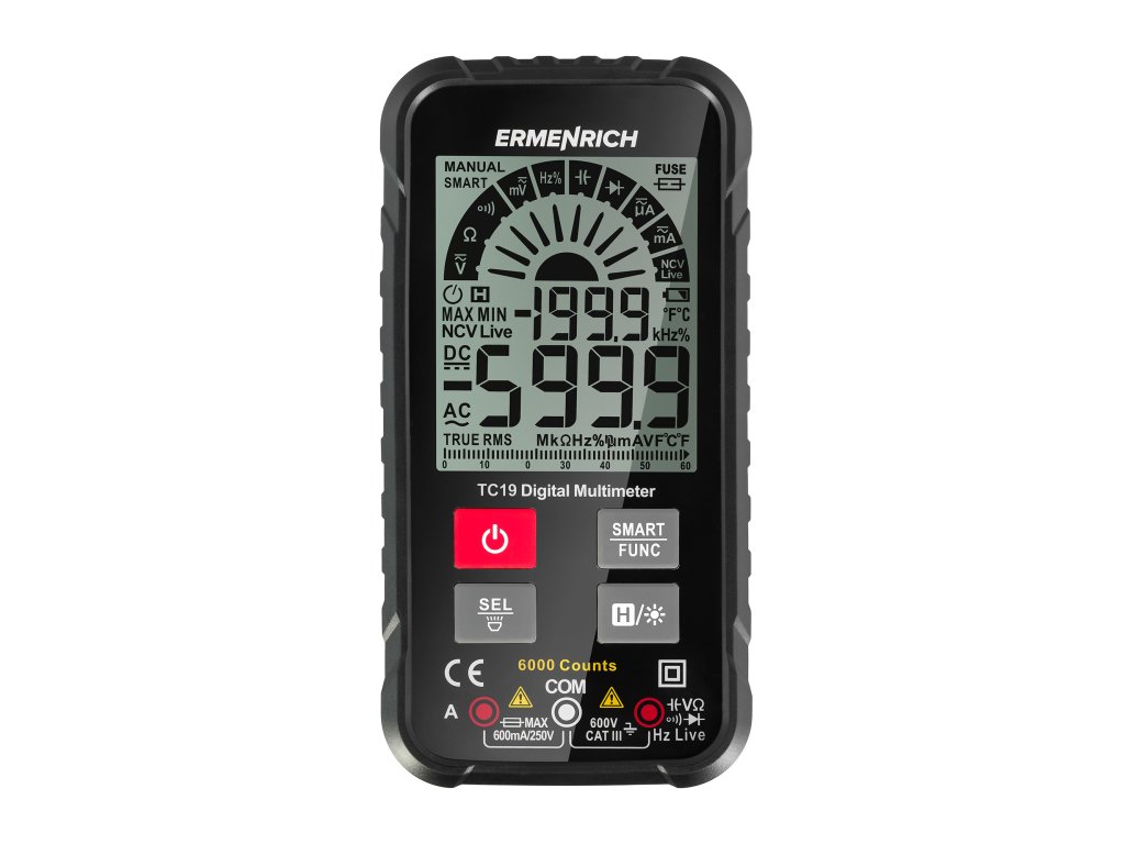 Digitální multimetr Ermenrich Zing TC19 je nezbytným nástrojem pro každodenní práci profesionálního elektrikáře. V každodenním životě pomáhá při testování elektrických spotřebičů a elektroinstalace a při hledání závad v elektrickém vybavení automobilu. Díky kompaktnímu a lehkému designu se snadno přenáší a jednoduché ovládání usnadňuje běžnou práci. Multimetr poskytuje vysokou přesnost měření, protože používá výpočty True RMS.