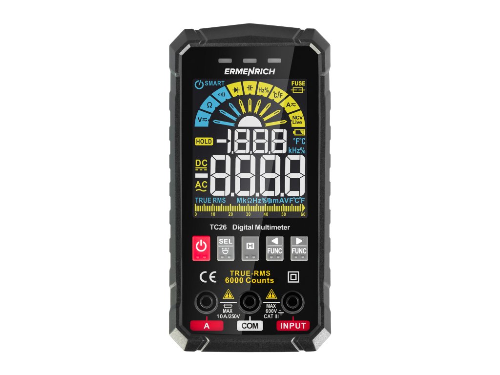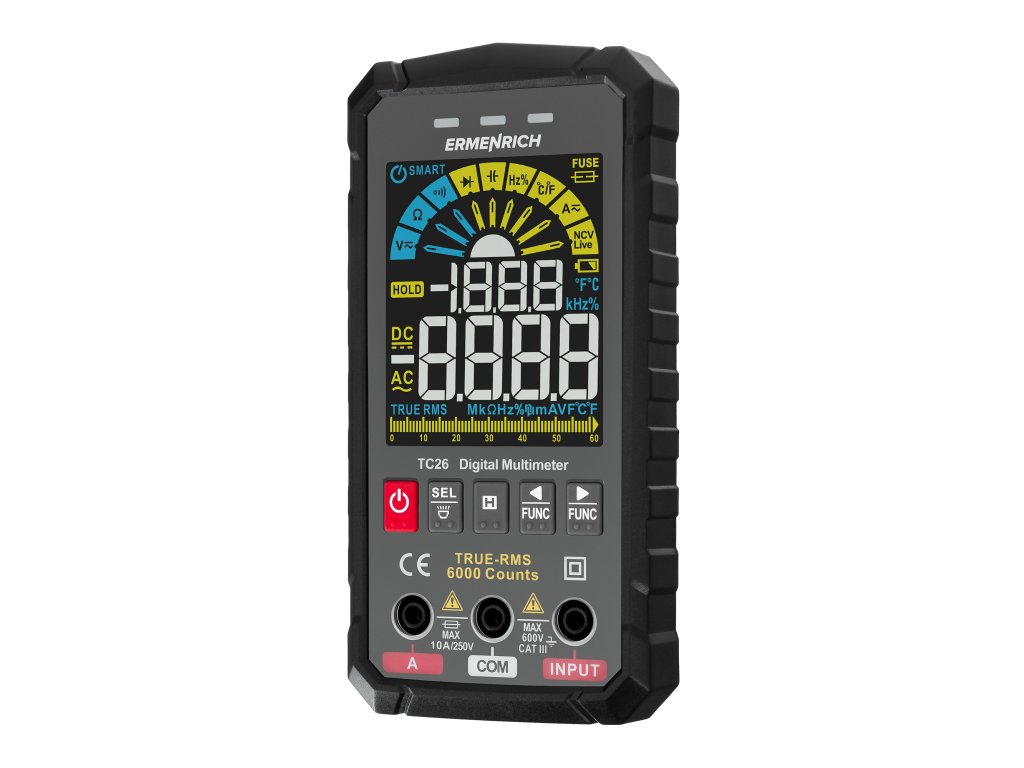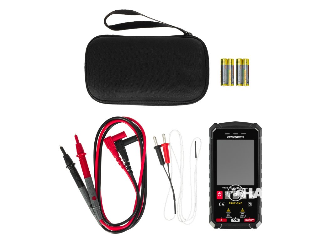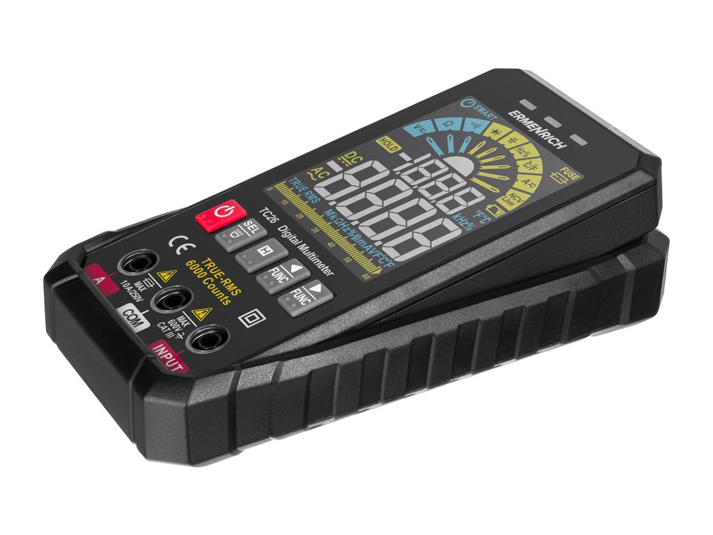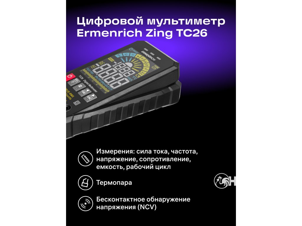 Digitální multimetr Ermenrich Zing TC26 je elektrický měřicí přístroj True RMS s voltmetrem, ampérmetrem, ohmmetrem, měřičem frekvence, kapacity, pracovního cyklu a termočlánkovým snímačem. Poskytuje skutečný výpočet efektivní hodnoty proměnných, a proto je velmi přesný. Přístroj je vhodný pro plnění profesionálních úkolů technika pracujícího s elektrickým zařízením a elektrickými sítěmi, ale je vhodný i pro kutily.