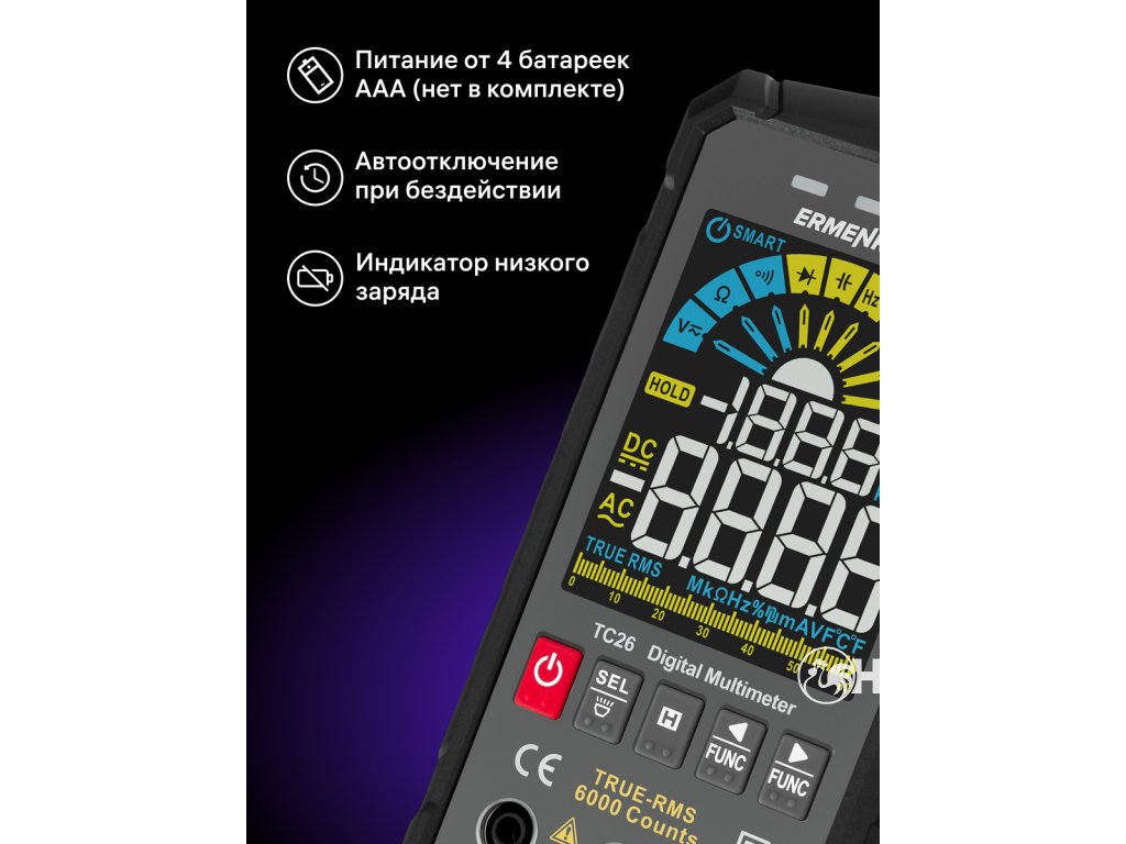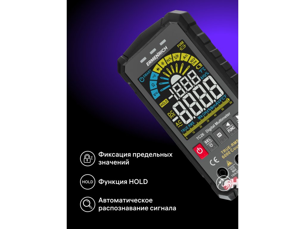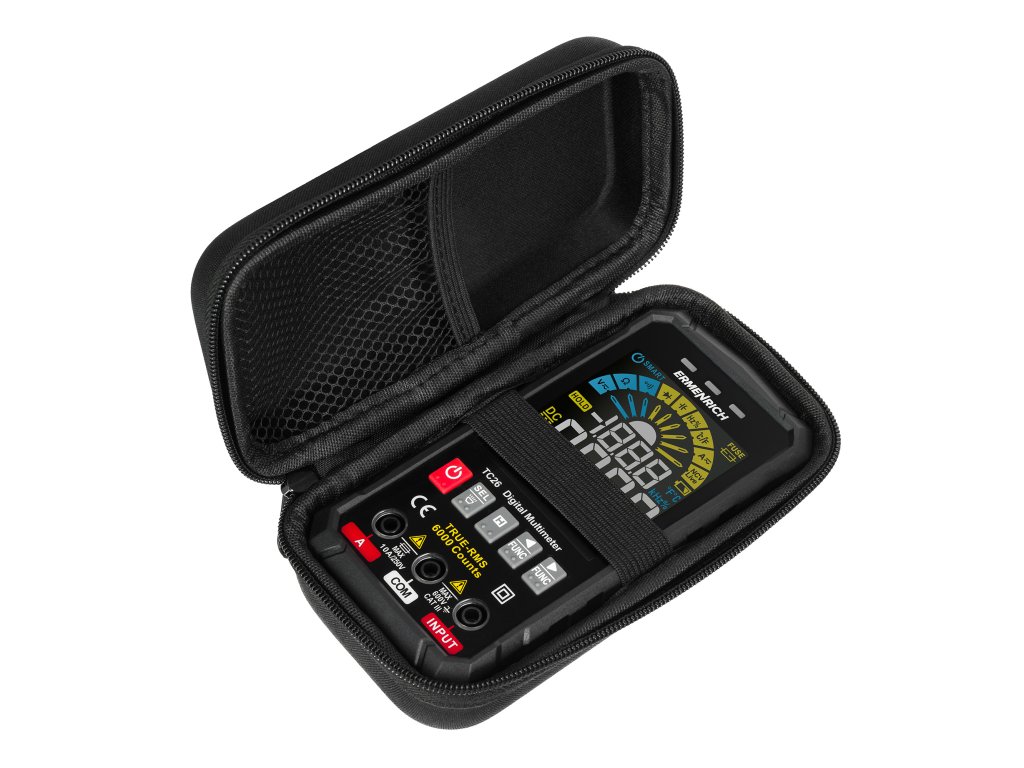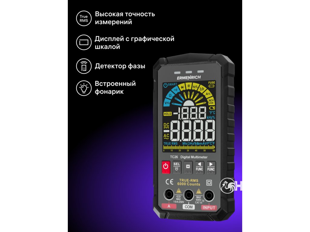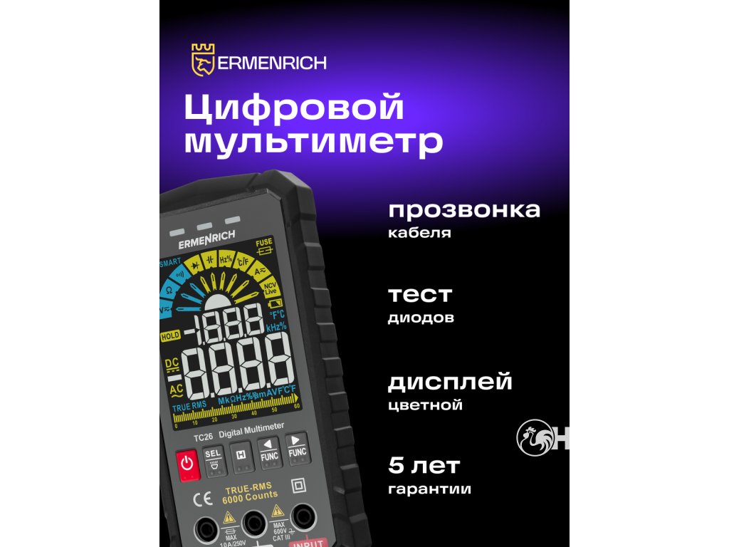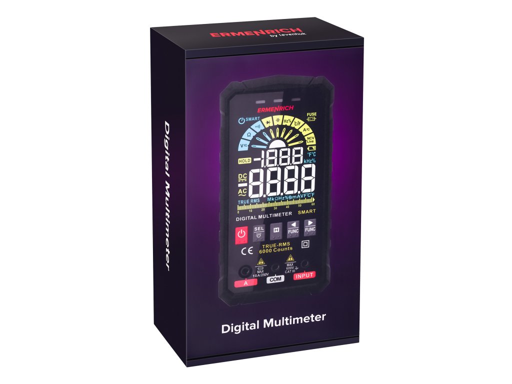 Digitální multimetr Ermenrich Zing TC26 je elektrický měřicí přístroj True RMS s voltmetrem, ampérmetrem, ohmmetrem, měřičem frekvence, kapacity, pracovního cyklu a termočlánkovým snímačem. Poskytuje skutečný výpočet efektivní hodnoty proměnných, a proto je velmi přesný. Přístroj je vhodný pro plnění profesionálních úkolů technika pracujícího s elektrickým zařízením a elektrickými sítěmi, ale je vhodný i pro kutily.