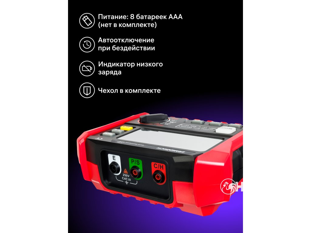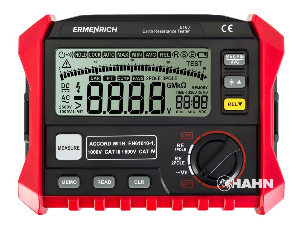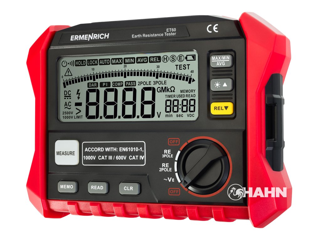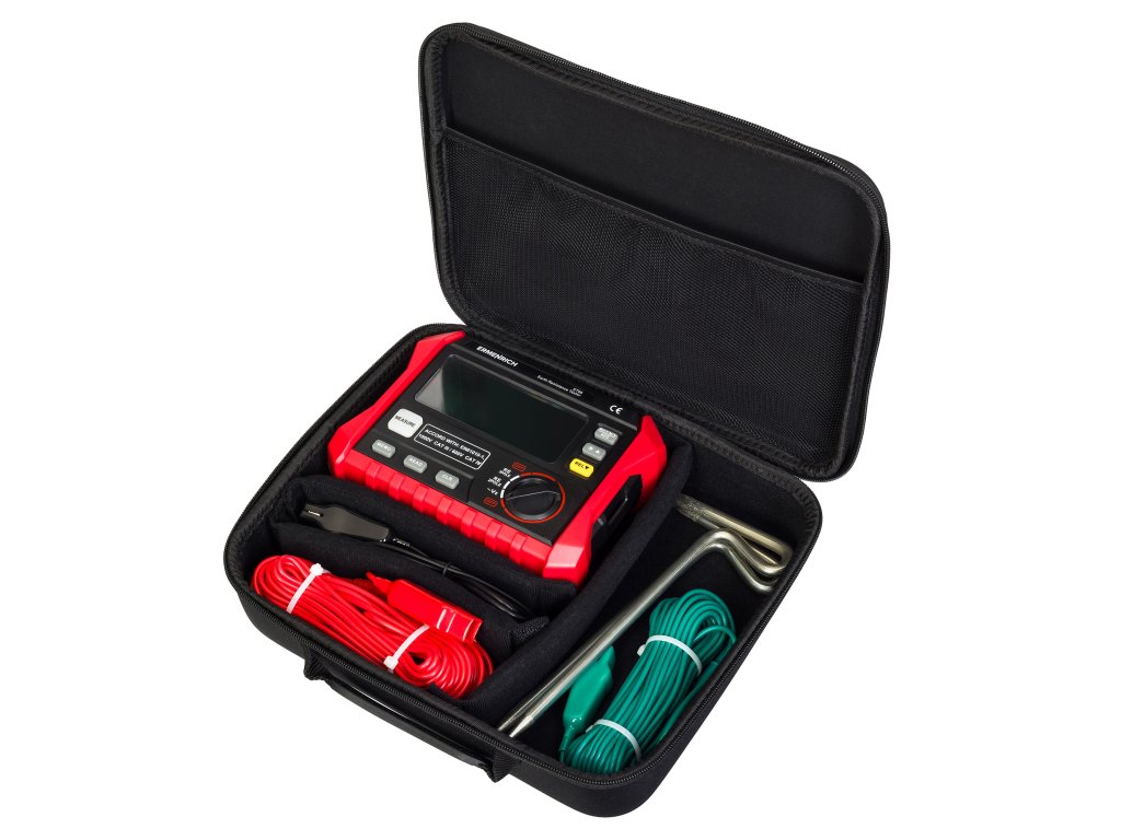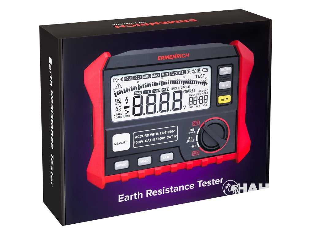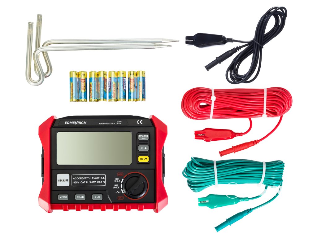 Tester zemního odporu Ermenrich Ping ET60 je přístroj, který je určen k měření zemního odporu v rozsahu 0 až 4 kΩ. Je vybaven vestavěným LCD displejem, třemi testovacími kabely různých délek a dvěma zemnícími tyčemi. Přístroj funguje na baterie, má funkci automatického vypnutí a upozorní vás na nutnost výměny baterií, pokud je jejich kapacita nedostatečná. Měření a diagnostiku zařízení doporučujeme provádět při vysoké úrovni kapacity baterie, jinak mohou být výsledky nespolehlivé.
