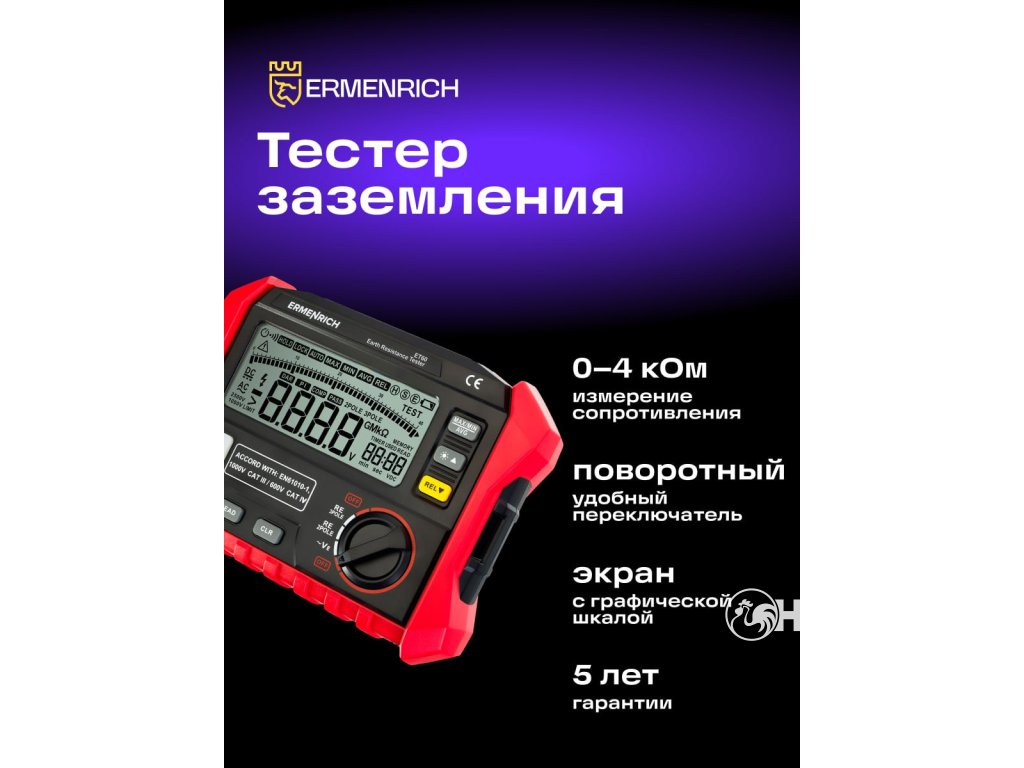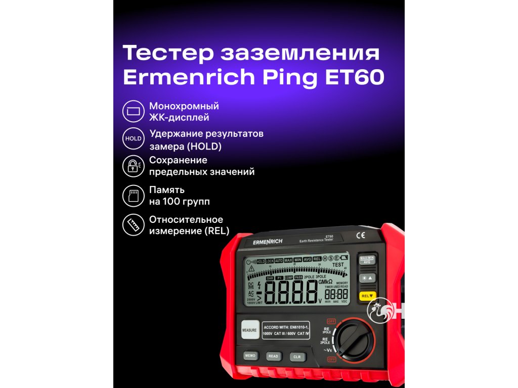 Ermenrich Ping ET60 je měřicí přístroj používaný pro testování elektrických rozvodů, projektování systémů ochrany před bleskem, diagnostiku stožárů vysokého napětí, budov, komunikačních stanic, vnitřních rozvodů, elektrických zařízení atd. Má vysokou přesnost měření a je vhodný pro použití při profesionální práci.