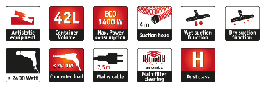 - Bezpečnostní vysavač třídy H: vhodný pro všechny druhy prachu s AGW-hodnotami < 0,1 mg/mł s přídavnou zkouškou "azbest" dle TRGS 519