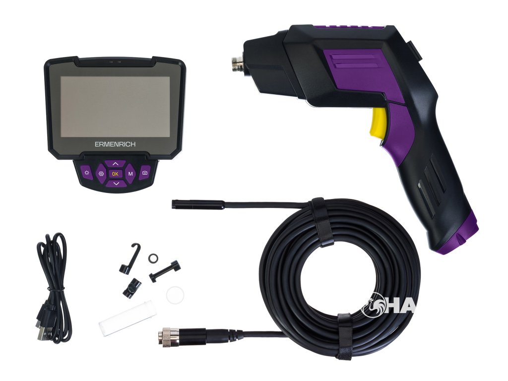 Ermenrich Seek VE50 je průmyslový endoskop (boroskop) s 5,5mm HD kamerou, která poskytuje 70° úhel pohledu. S tímto přístrojem lze díky flexibilnímu husímu krku o délce 10 metrů snadno kontrolovat všechna těžko přístupná místa. Může se jednat o vnitřní potrubí, prostor uvnitř stěn, vnitřní prostor spalovacího motoru, náklad v kontejneru atd. Endoskop je snadný a účinný nástroj, který lze používat jak v domácnosti, tak pro profesionální účely.