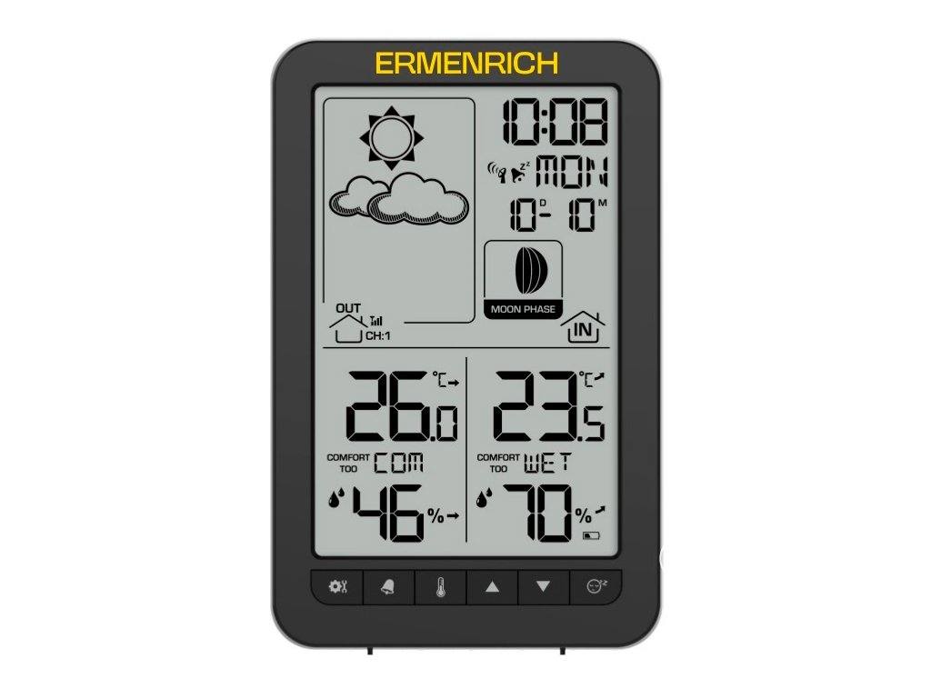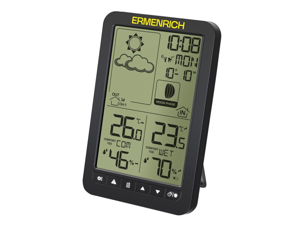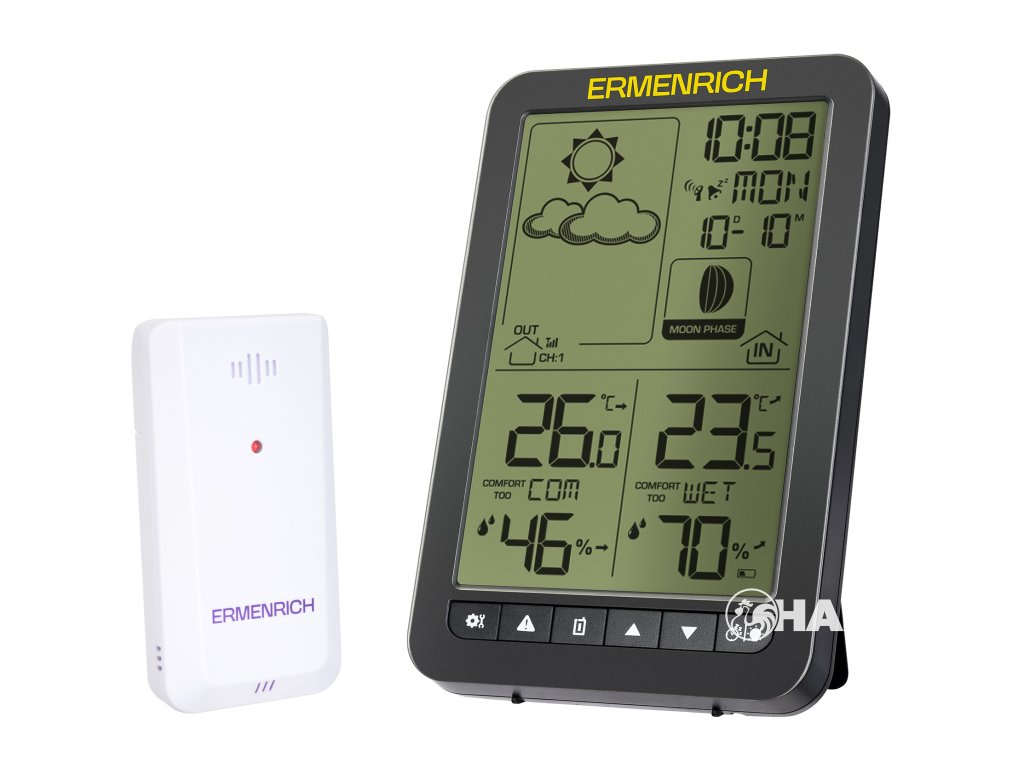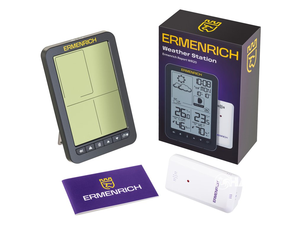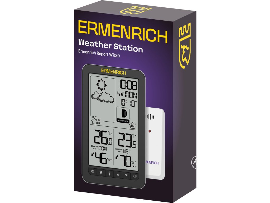 Meteorologická stanice Ermenrich Report WR20 je kompaktní přístroj pro měření základních atmosférických parametrů v interiéru i exteriéru, konkrétně teploty a vlhkosti. Její funkce zahrnují také hodiny, kalendář a budík, což poskytuje vše potřebné pro každodenní používání 24 hodin denně, 7 dní v týdnu.