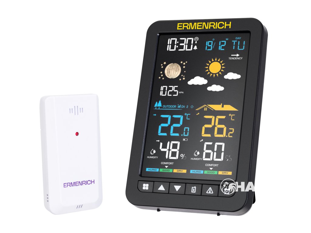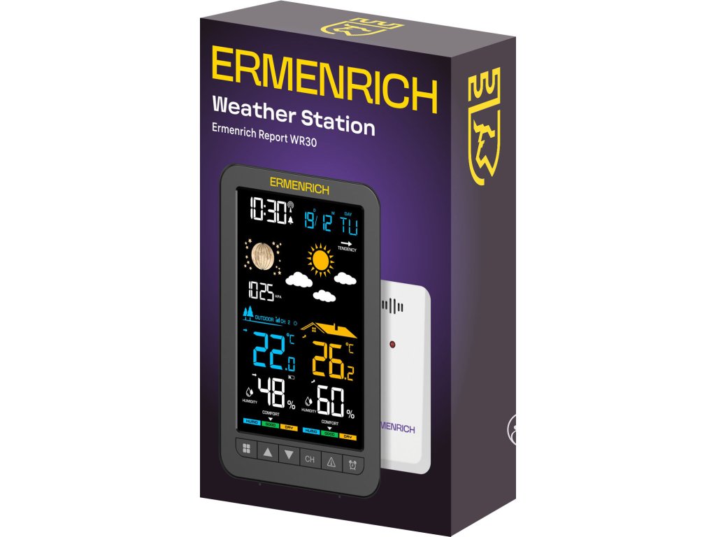 Meteorologická stanice Ermenrich Report WR30 je multifunkční domácí přístroj, který je užitečný jak pro měření atmosférických parametrů (vlhkost, teplota, atmosférický tlak), tak i pro každodenní použití, protože poskytuje rychlý přístup k základním informacím, jako například čas, aktuální datum, předpověď počasí nebo fáze Měsíce. Na velkém, barevném a snadno čitelném displeji se zobrazuje jasný text a intuitivní ikony, kterým porozumí i ti nejmladší členové rodiny. Ve spodní části displeje jsou dvě stupnice pro hodnocení celkových indikátorů úrovně komfortu vypočítaných na základě údajů z vnitřního a venkovního prostředí.