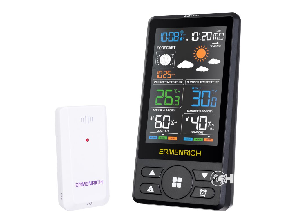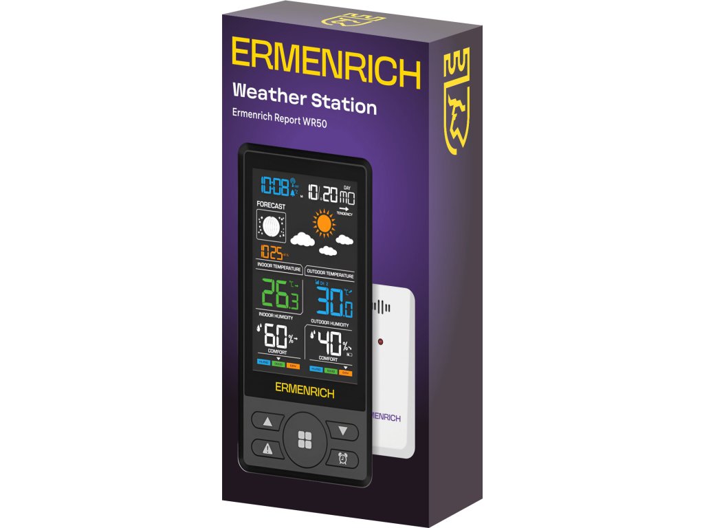 Domácí meteorologická stanice Ermenrich Report WR50 má širokou škálu funkcí, které jsou v každodenním životě neocenitelné. Pomáhá sledovat změny počasí venku a regulovat mikroklima uvnitř. Na velkém barevném displeji se zobrazují všechny důležité informace o atmosféře: teplota a vlhkost vzduchu uvnitř i venku, atmosférický tlak, předpověď počasí a úroveň komfortu. Přístroj může také fungovat jako digitální hodiny a kalendář, přičemž pro tyto informace je určena spodní část displeje. Pokud přístroj umístíte na noční stolek, může sloužit také jako budík. Zájemci o astronomii nebo lidové pověry jistě uvítají další užitečný parametr, který se zobrazuje na displeji: fáze Měsíce.