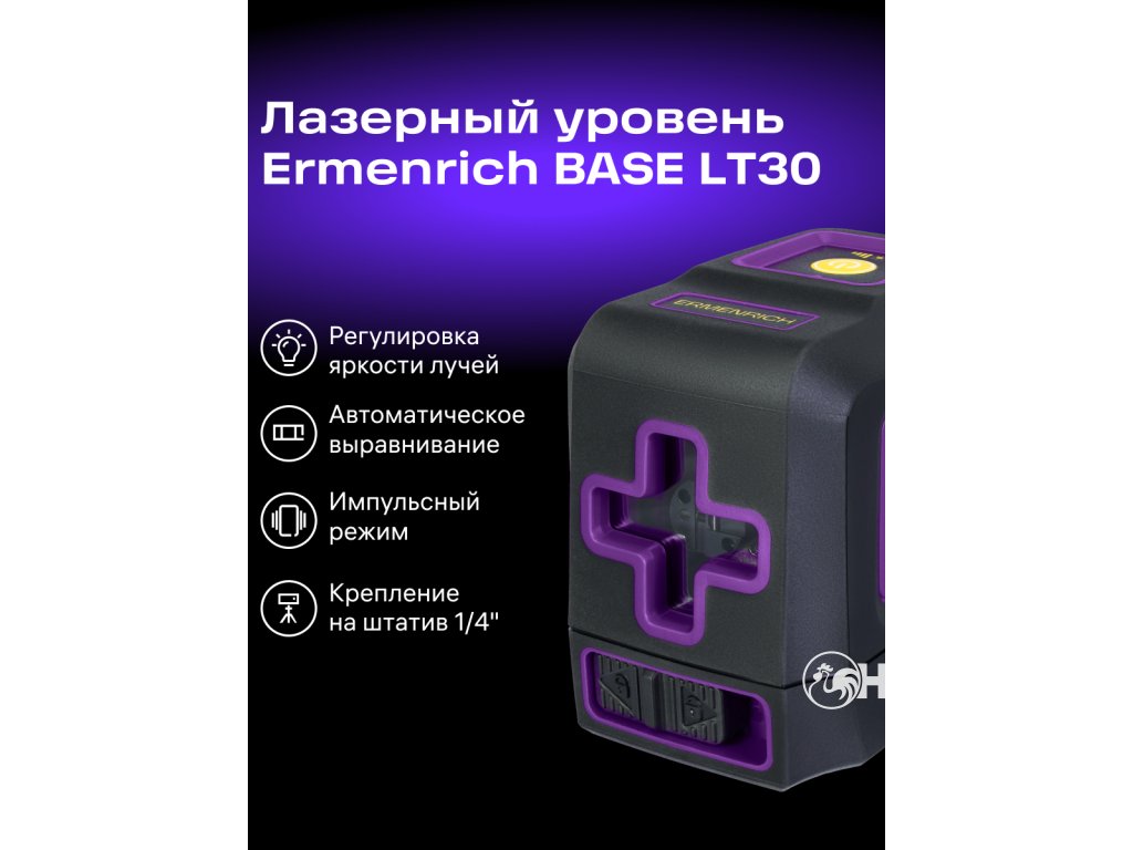 Ermenrich BASE LT30 je laserový nivelační přístroj se zelenými laserovými LED diodami. Promítá dvě příčné linie pro efektivní vyrovnání při malování, omítání, obkladech, sádrokartonových a jiných dokončovacích pracích. Hladina může být umístěna ve značné vzdálenosti od povrchu, na který jsou laserové paprsky promítány – až 30 metrů. Horizontální a vertikální rozptyl je 130°. Zařízení je napájeno dvojicí standardních baterií. K dispozici jsou čtyři úrovně jasu.