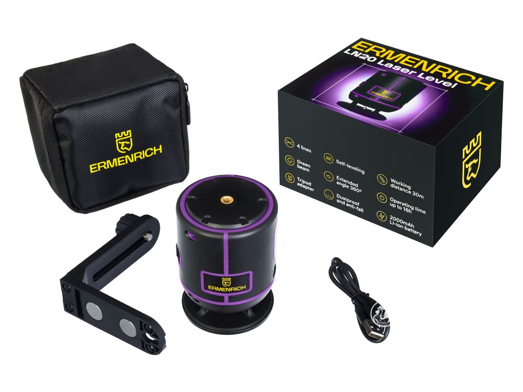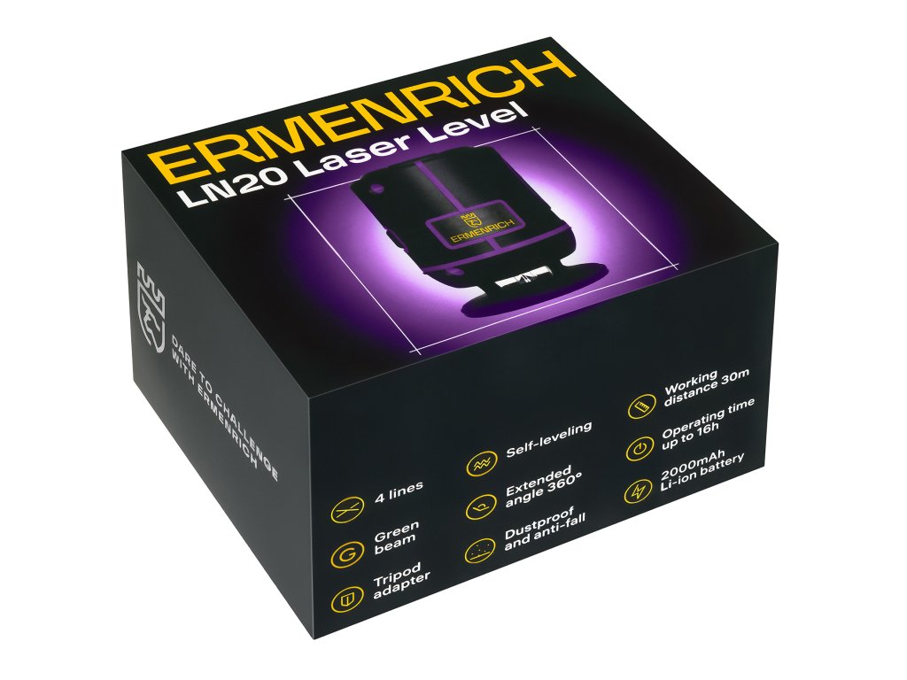 Ermenrich PLUS LN20 je přenosný samonivelační laserový přístroj, který generuje čtyři čáry zelené barvy v horizontální rovině. Horizontální rozptyl – plných 360°. Pomůcka je ideální pro použití při stavebních a renovačních pracích, stejně tako i pro instalaci zařízení a osvětlení. Velká pracovní vzdálenost vám umožní pokrýt velký obvod, aniž byste museli zařízení přemisťovat – může dosáhnout i na vzdálenou zeď. Kompenzátor snižuje vibrace a automaticky vyrovnává rovinu laseru.