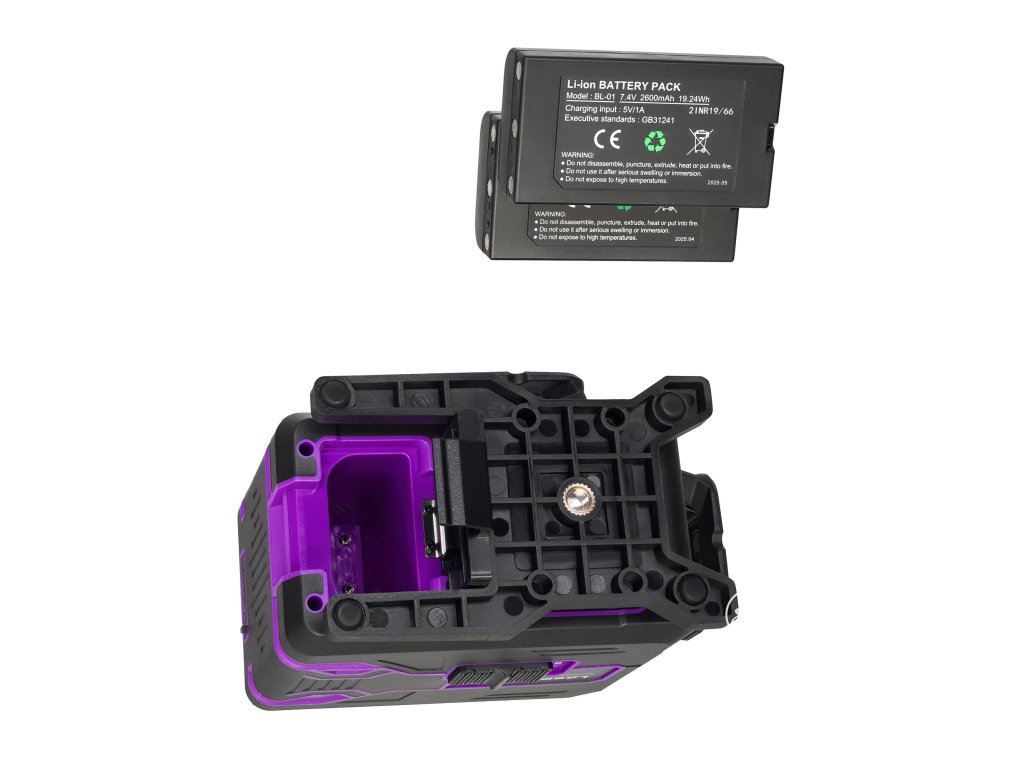 Přístroj Ermenrich PRO LV70 je napájen vyměnitelnou lithium-iontovou baterií s kapacitou 2600 mA h, která se nabíjí ze síťového zdroje pomocí kabelu USB typu C (součást dodávky) a standardního síťového adaptéru (doporučuje se použít adaptér 5 V/2 A). Dálkové ovládání je napájeno baterií CR2032. Vezměte prosím na vědomí, že tento laserový nivelační přístroj má pouze malý stupeň ochrany proti prachu a vlhkosti. Aby nedošlo k poškození přístroje, chraňte jej před přímým působením vlivů okolního prostředí.