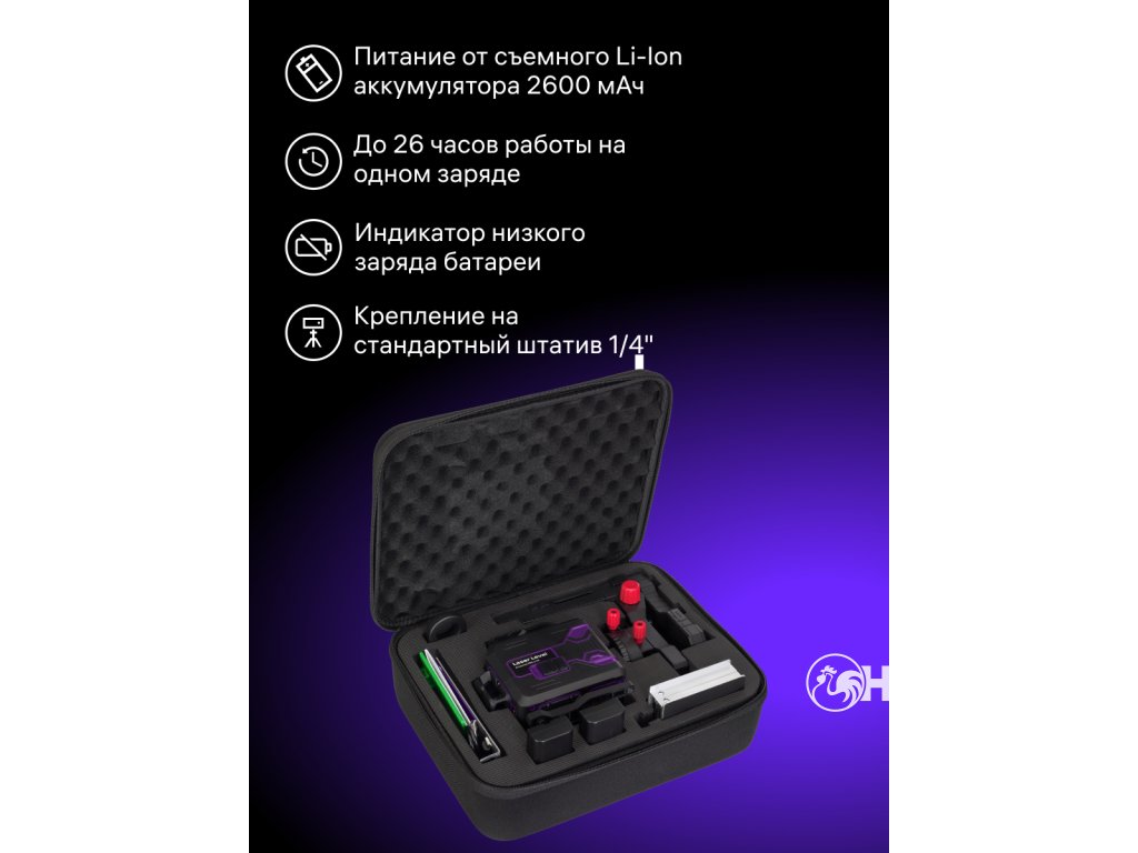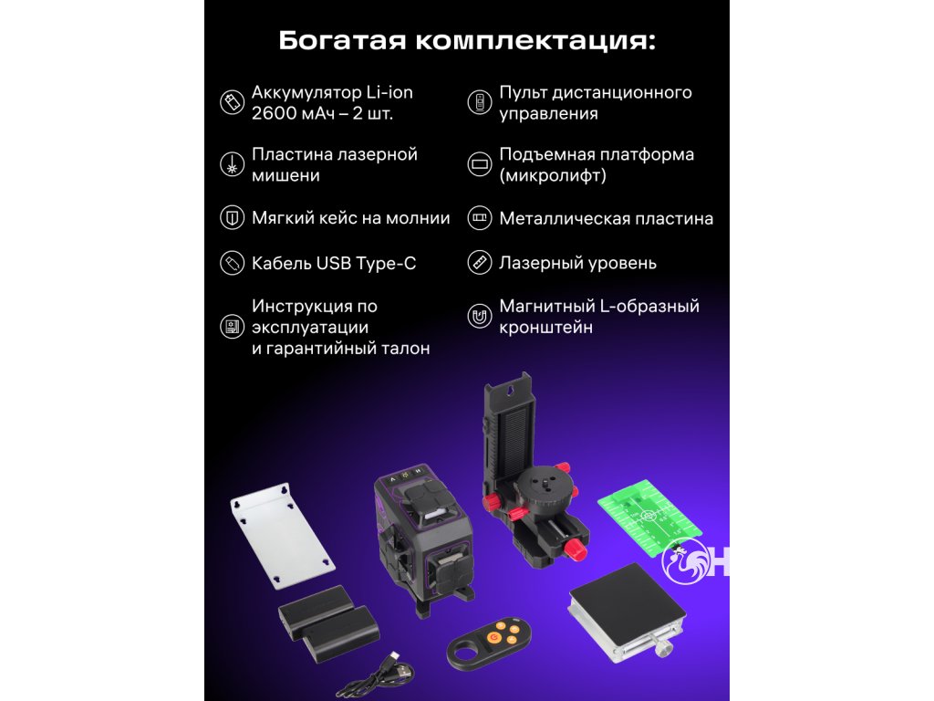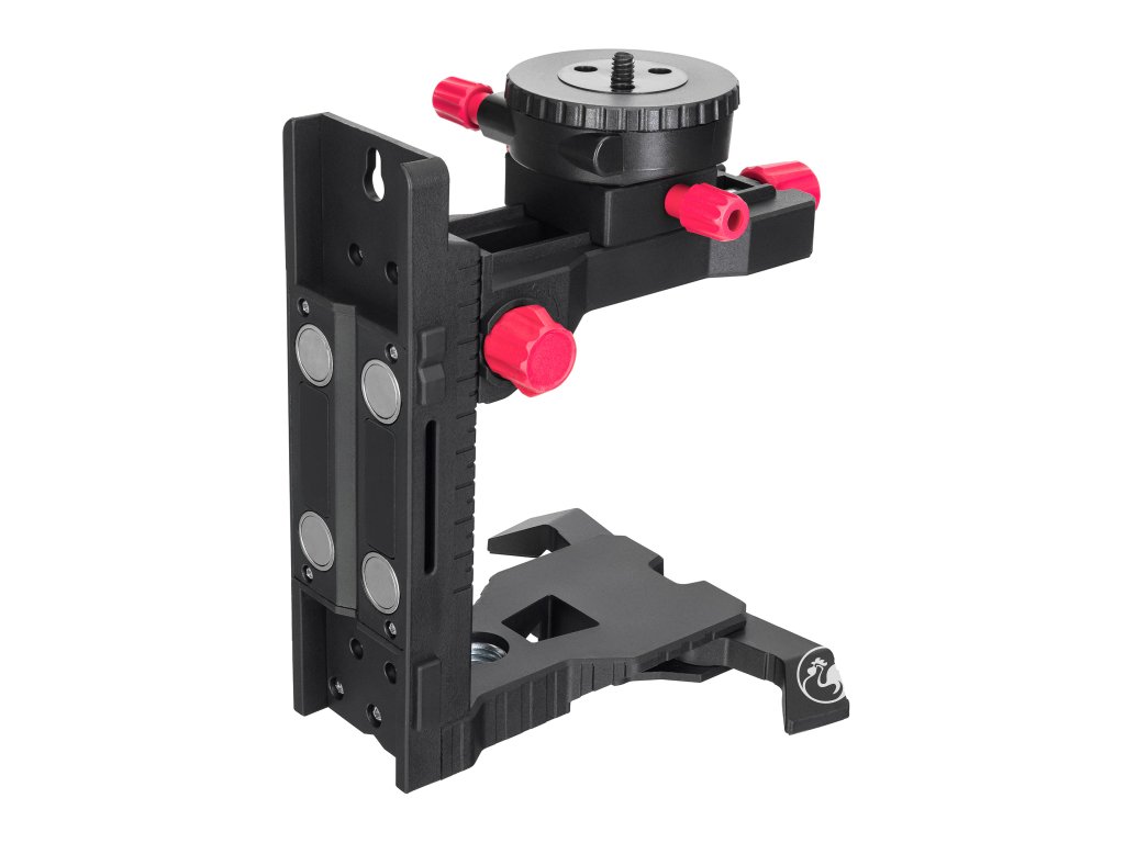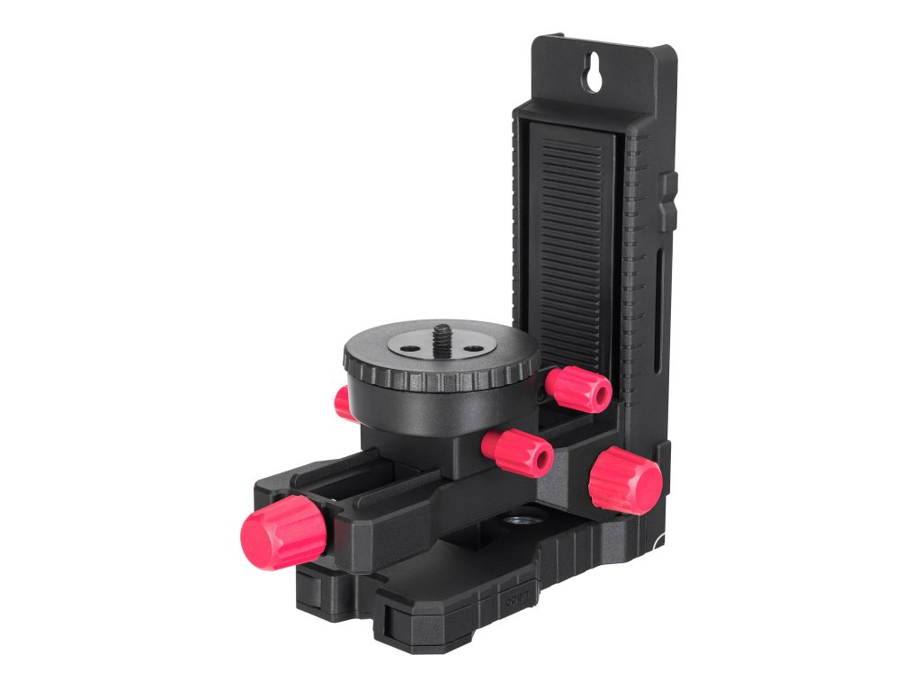 Další důležitou vlastností přístroje je komplexní sada upevňovacích prvků. Držák ve tvaru L má magnety pro kovové povrchy; lze jej také připevnit k desce ze sady laserového nivelačního přístroje. Plošina držáku ve tvaru L se pohybuje svisle nahoru/dolů, vodorovně ode zdi/ke zdi a otáčí se v horizontální rovině, což zajišťuje pohodlné a přesné umístění laserového nivelačního přístroje za jakýchkoli provozních podmínek. Sada navíc obsahuje mikrozvedák s jemným vertikálním pohybem.