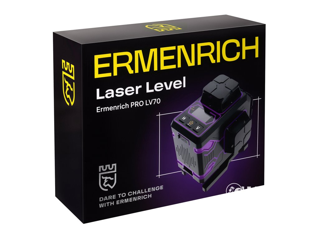 Vlnová délka laseru: 505–550 nm; třída laseru: 2. Pro dosažení nejlepších výsledků přístroj používejte pouze v interiéru nebo venku za oblačného počasí (zvyšuje se viditelnost projekce laserových čar). Přístroj Ermenrich PRO LV70 se snadno přenáší díky svým kompaktním rozměrům a relativně nízké hmotnosti (něco přes 500 gramů). Součástí dodávky je dálkové ovládání, které rozšiřuje funkčnost nivelačního přístroje. Jeho maximální provozní dosah je 10 metrů. Přístroj je také vybaven LCD displejem pro snadné a rychlé čtení informací o úhlu náklonu a zbývajícím nabití baterie.