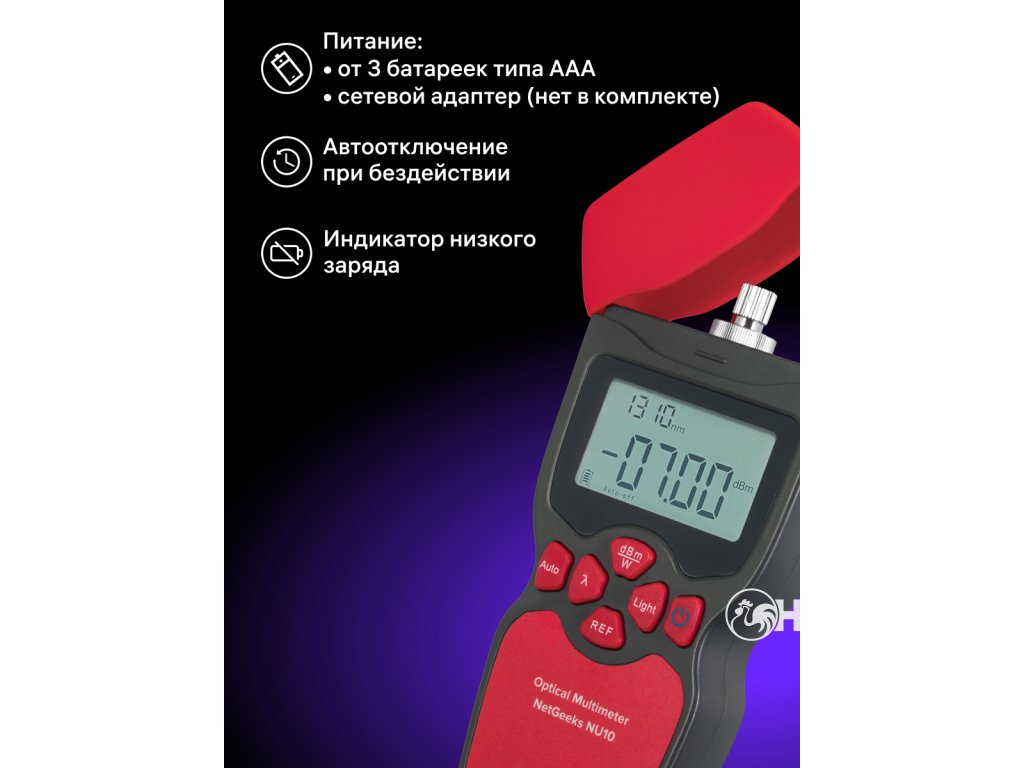 Multimetr podporuje šest vlnových délek: Stisknutím tlačítka si můžete vybrat požadovanou vlnovou délku. Pro připojení se používají rozhraní FC/SC/ST. K dispozici je možnost nastavení referenční úrovně pro aktuální vlnovou délku, což usnadňuje určení ztráty výkonu. Měření se zobrazují na vestavěném LCD displeji. Přístroj funguje na baterie. Funkce automatického vypnutí pomáhá šetřit energii.