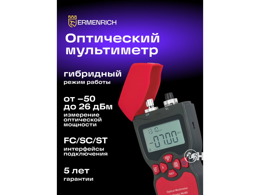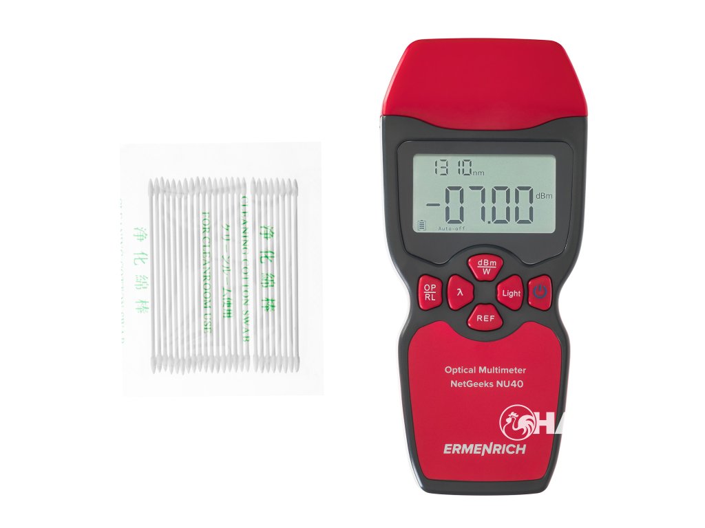 Optický multimetr neboli měřič optického výkonu Ermenrich NetGeeks NU40 – nezbytný nástroj pro profesionály, kteří instalují a udržují optické komunikační linky (FOCL). Přístroj umožňuje měřit absolutní výkon a zjišťovat ztráty mezi dvěma body vedení. Přístroj disponuje funkcí světelného zdroje pro kontrolu optických kabelů. Multimetr je vybaven dvěma konektory a podporuje hybridní provozní režim: při testování kabelu může současně fungovat jako měřič optického výkonu i jako zdroj světla pro vyhodnocení ztráty signálu.