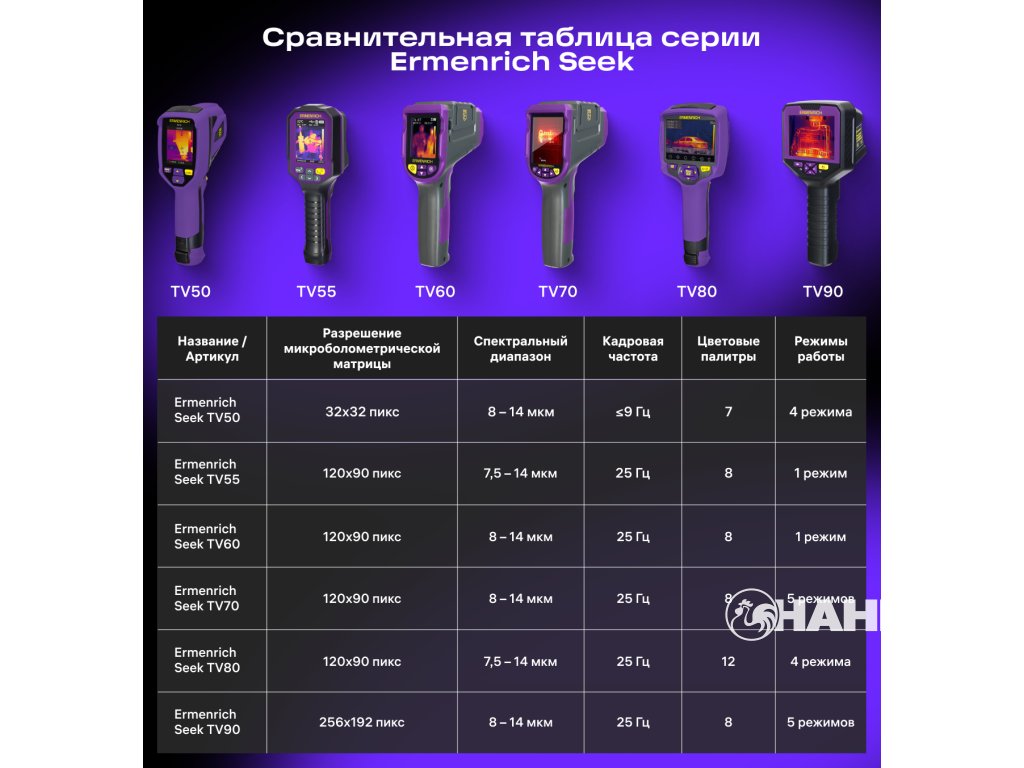 Zařízení je vybaveno snímačem teploty 120x90 px s citlivostí 40 mK pro jasné a tiché snímání. Rozsah měření –20 °C až +550 °C je vhodný pro průmyslové aplikace. Termogramy jsou přehledně zobrazeny na velkém 3,5palcovém LCD displeji s vysokým rozlišením 640x480 px. To umožňuje podrobnou analýzu na místě bez nutnosti přenosu dat do počítače. Obnovovací frekvence 25 Hz zajišťuje plynulé zobrazování při pohybu. Kromě osmi standardních barevných palet je model Ermenrich Seek TV80 vybaven čtyřmi specializovanými paletami alarmů pro vysoké/nízké teplotní limity. Ve dvou režimech termokamera zvýrazňuje oblasti s teplotami, které překračují nastavené limity. V ostatních dvou režimech je barevný důraz kladen na oblasti spadající do zadaného teplotního rozsahu. To umožňuje okamžitou identifikaci kritických hodnot teploty a vyloučení oblastí s přijatelnou teplotou z další analýzy.