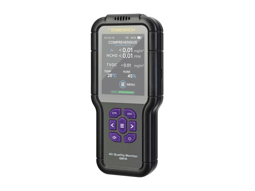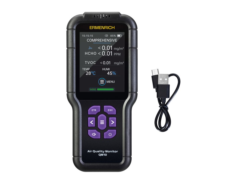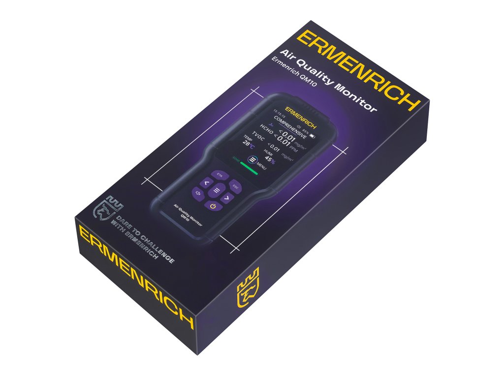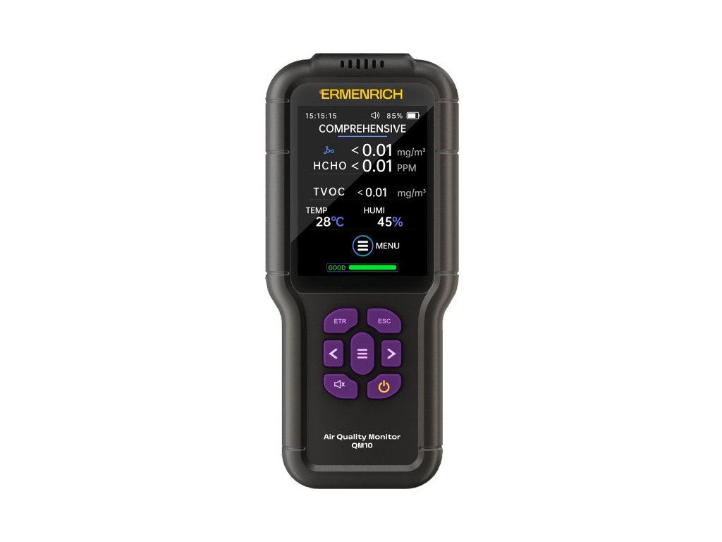 Monitor kvality ovzduší Ermenrich QM10 je kapesní přístroj pro analýzu složení vzduchu v interiéru, detekci zvýšených hladin škodlivých látek a monitorování mikroklimatu. Lze jej použít v domácnostech a komerčních zařízeních – kancelářích, hotelech, školách a školkách, kavárnách, obchodech atd., ale ne pro průmyslové účely – rozsah měření TVOC (těkavých organických látek) je 0,0–10,0 mg/m3, což je nedostatečné pro detekci vyšších koncentrací, které se běžně vyskytují v průmyslových zařízeních.
