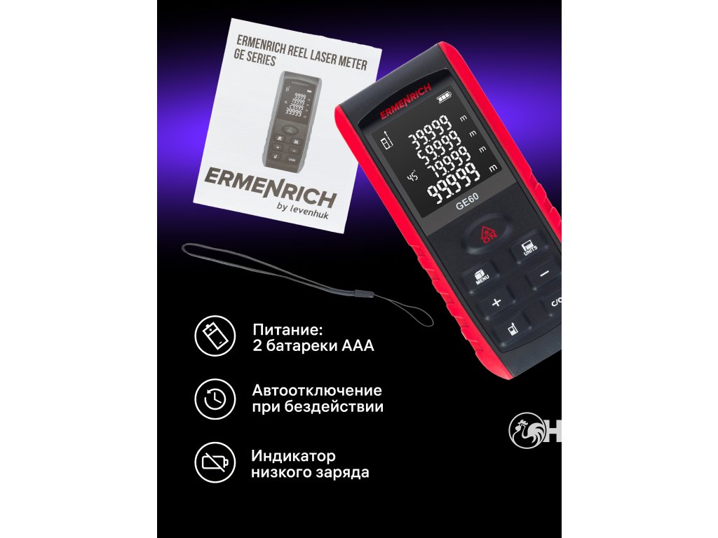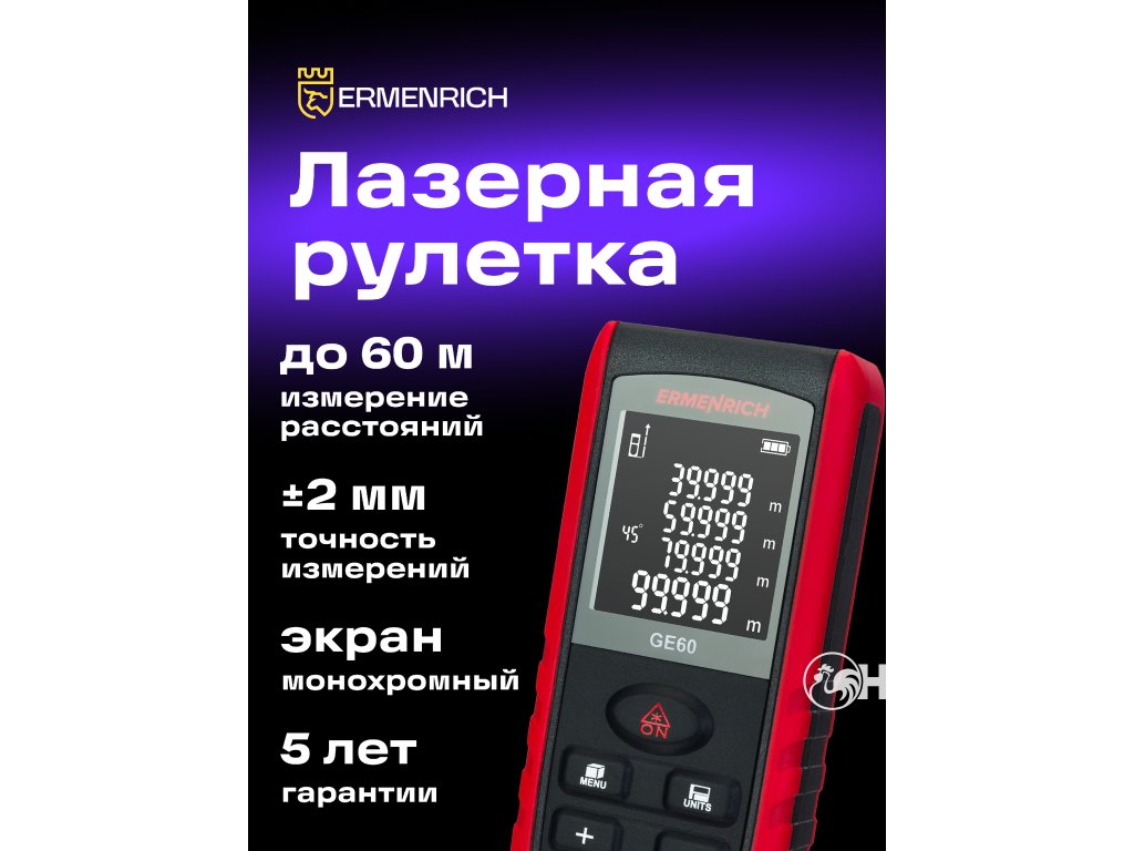 Laserový měřič Ermenrich Reel PRO GE60 umožňuje provádět přesná měření vzdálenosti v rozsahu 0,05 až 60 metrů a také měřit úhly, plochy a objemy místností a objektů. Důležitou výhodou přístroje je funkce Pythagorovy věty: pokud není možné umístit měřič do požadované polohy nebo se v dráze laseru objeví překážka, stačí provést dvě dodatečná měření, ze kterých měřič vypočítá vzdálenost.
