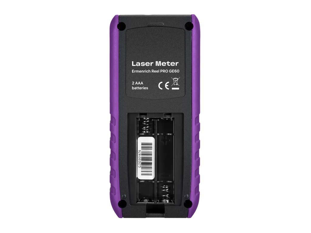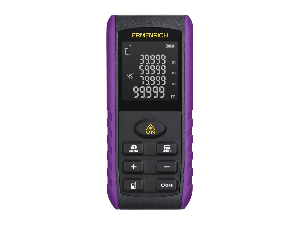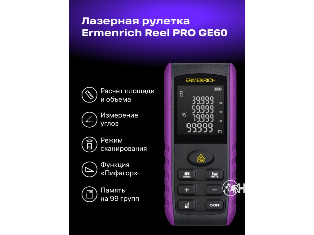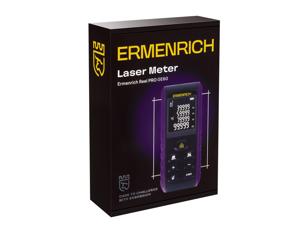 Laserový měřič Ermenrich Reel PRO GE60 umožňuje provádět přesná měření vzdálenosti v rozsahu 0,05 až 60 metrů a také měřit úhly, plochy a objemy místností a objektů. Důležitou výhodou přístroje je funkce Pythagorovy věty: pokud není možné umístit měřič do požadované polohy nebo se v dráze laseru objeví překážka, stačí provést dvě dodatečná měření, ze kterých měřič vypočítá vzdálenost.
