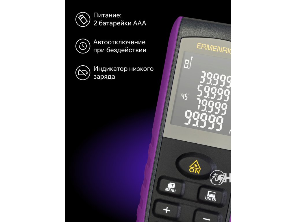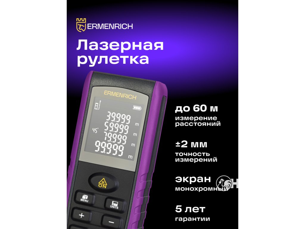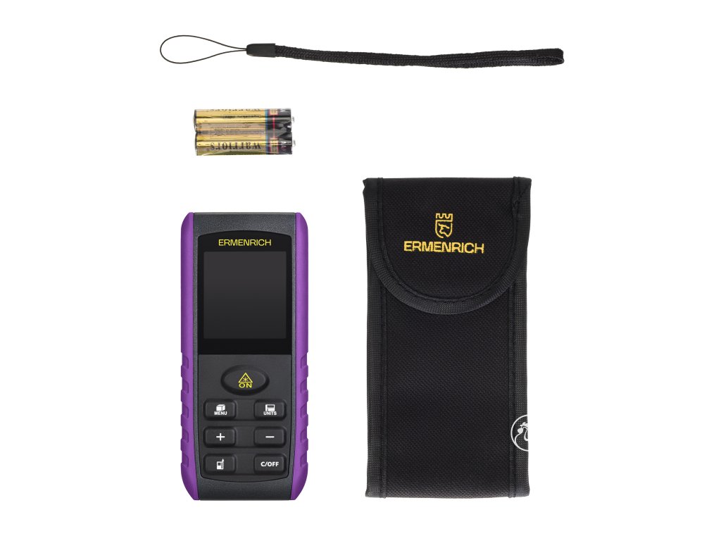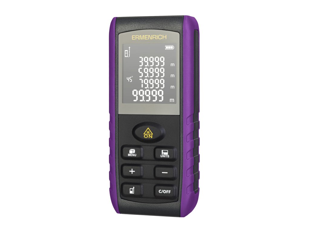 Laserový měřič Ermenrich Reel PRO GE60 umožňuje provádět přesná měření vzdálenosti v rozsahu 0,05 až 60 metrů a také měřit úhly, plochy a objemy místností a objektů. Důležitou výhodou přístroje je funkce Pythagorovy věty: pokud není možné umístit měřič do požadované polohy nebo se v dráze laseru objeví překážka, stačí provést dvě dodatečná měření, ze kterých měřič vypočítá vzdálenost.