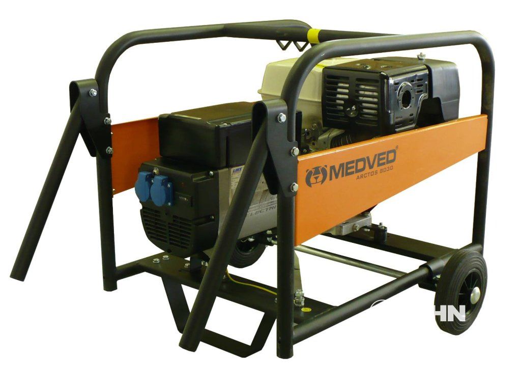 Transportní kolečka k elektrocentrále MEDVED. Podvozek se skládá ze dvou gumových kol a rukojeti pro snadný převoz. Osa kol se instaluje pod těžiště stroje, tak aby námaha při převozu stroje byla minimální.