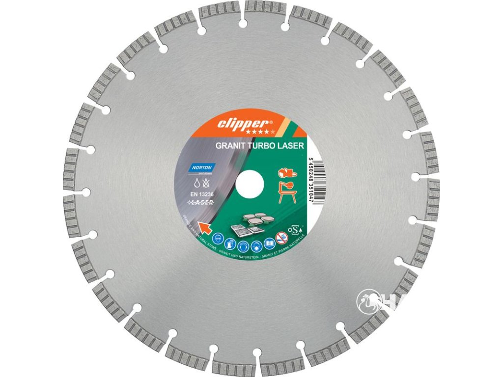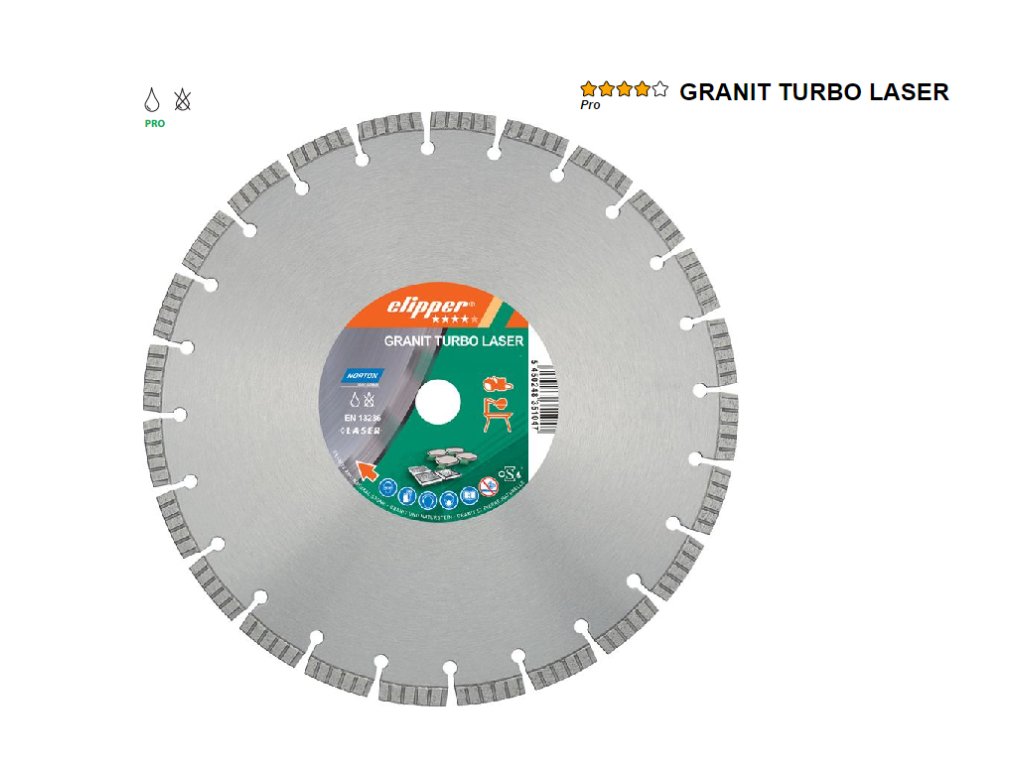 Laserem svařovaný kotouč je výkonný zejména při řezání žuly a tvrdého kamene. 12mm vysoký turbo segment zajišťuje dlouhou životnost kotouče při suchém i mokrém řezu.