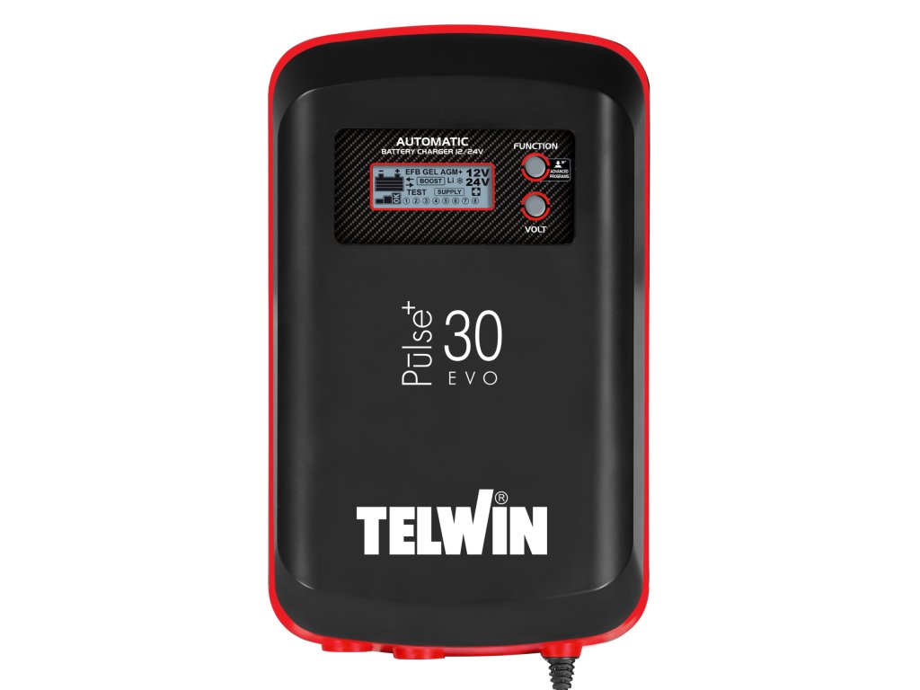 Microprocesorová pulsní nabíječka Pulse 30 EVO Telwin, 12-24 V s funkcí desulfatizace autobaterie, nabíjí automaticky všechny druhy autobaterií.