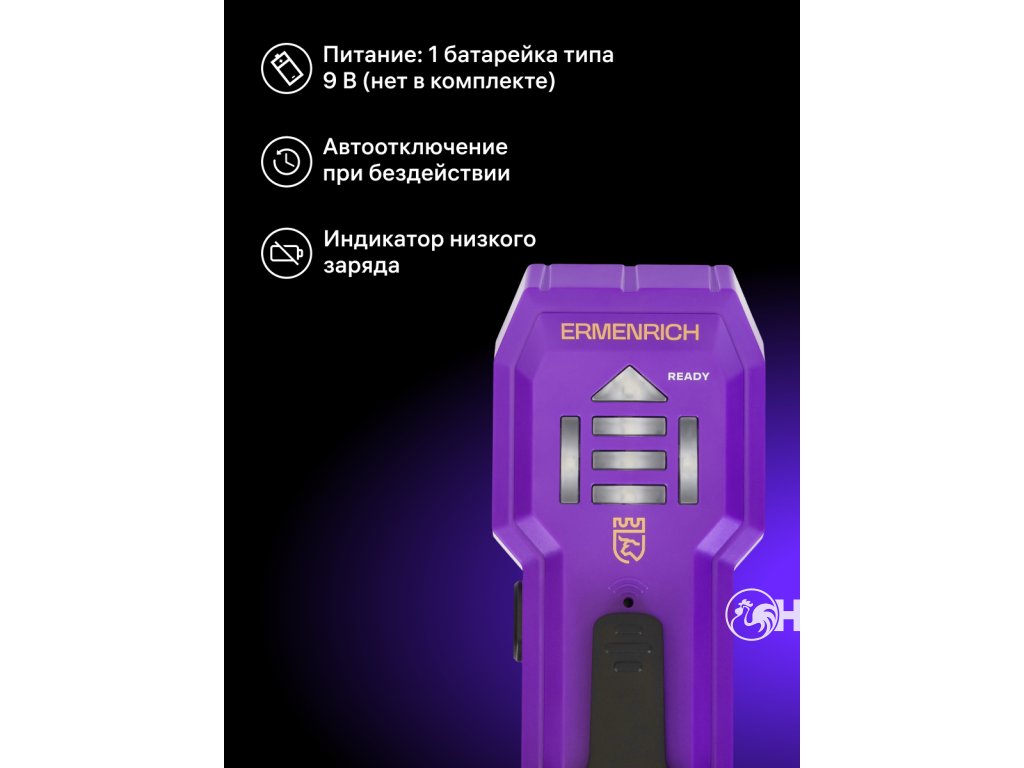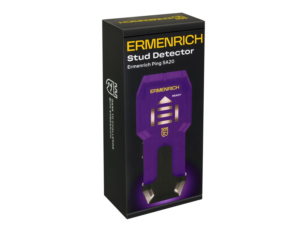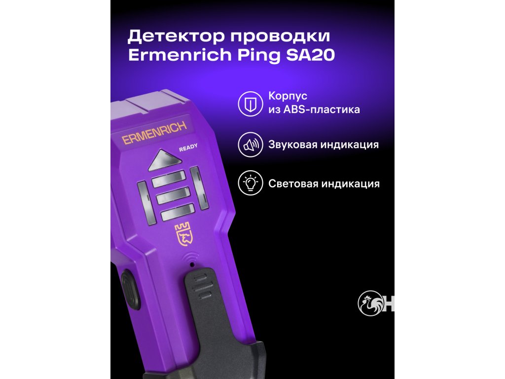 Přístroj Ermenrich Ping SA20 vás při vyhledání kovových a dřevěných konstrukcí upozorní zvukovým signálem. Je napájen standardní 9voltovou baterií, disponuje indikátorem stavu baterie a funkcí automatického vypnutí, která šetří energii tím, že se přístroj automaticky vypne, když je v nečinnosti. Tělo stavebního detektoru je vyrobeno z polykarbonátu a vysoce pevného ABS plastu, což zaručuje odolnost a dlouhou životnost přístroje.