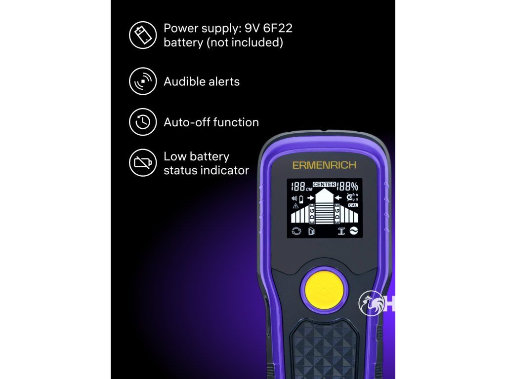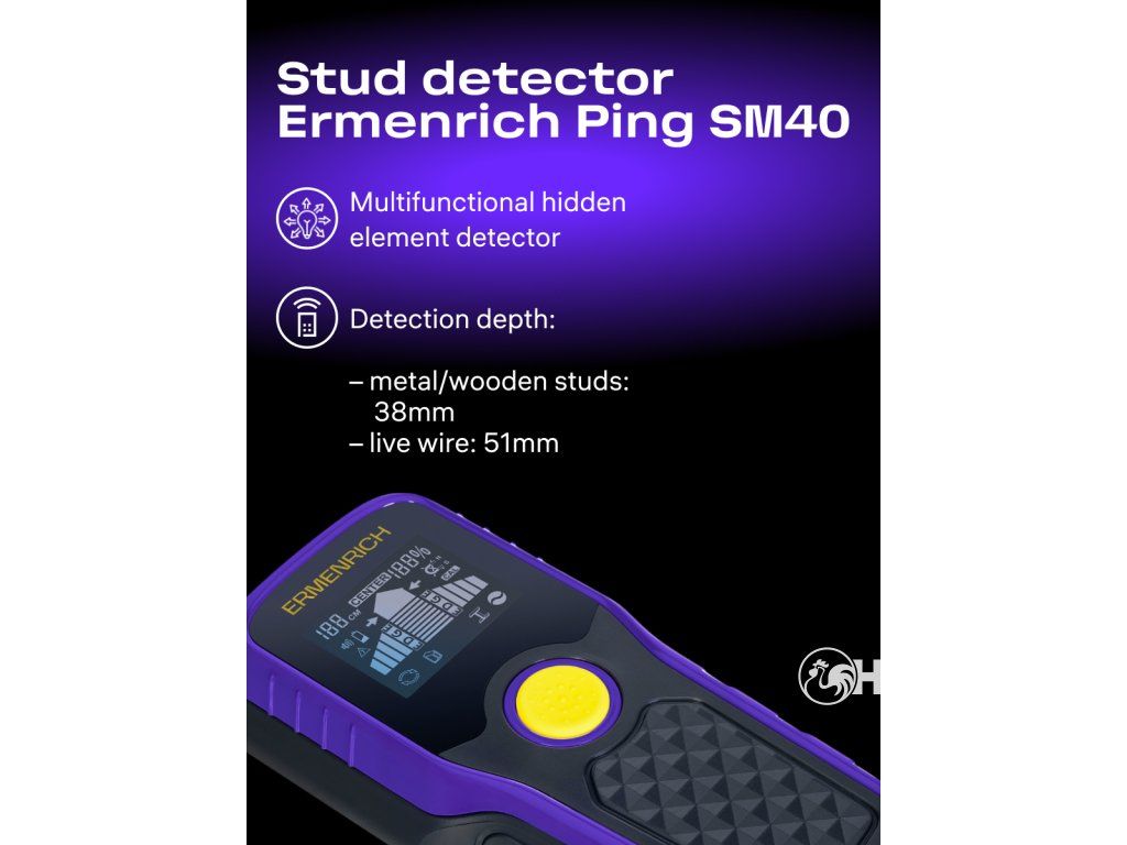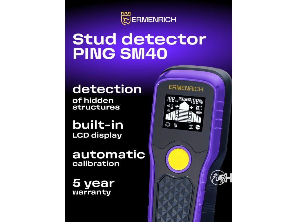 Ermenrich Ping SM40 je multifunkční detektor skrytých prvků, který je navržen pro dlouhou životnost při stavebních, rekonstrukčních a instalačních pracích. Odolné tělo, které je vyrobeno z nárazuvzdorného a otěruvzdorného ABS plastu, má tři režimy skenování (svorníky, kovy a vodiče pod napětím). Přístroj automaticky zvolí optimální režim detekce podle nejsilnějšího signálu a rychle se přizpůsobuje různým úkolům.