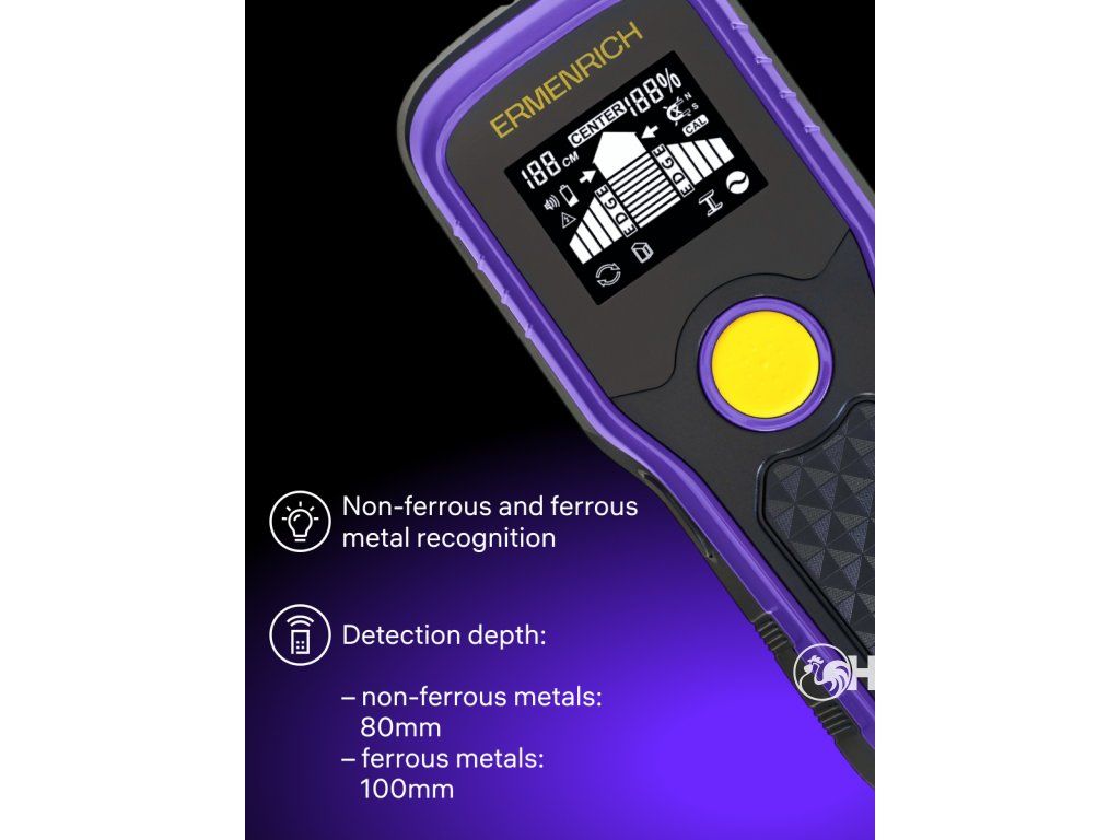 - Detekce železných kovů až do hloubky 100 mm a neželezných kovů až do hloubky 80 mm díky vysoce citlivému senzoru, což zajišťuje přesné výsledky vyhledávání i při skenování hustých materiálů