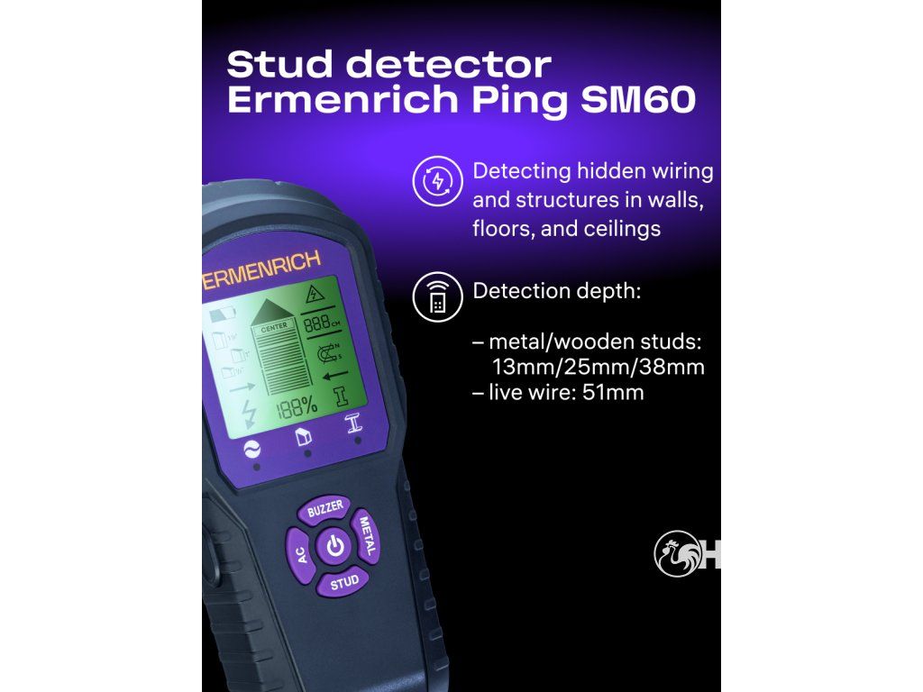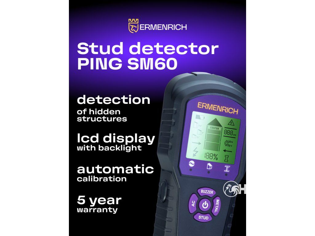 Stavební detektor Ermenrich Ping SM60 je vybaven zvukovým upozorněním a podsvíceným LCD displejem. Kalibrace je automatická. Tělo s praktickými ovládacími tlačítky je vyrobeno z polykarbonátu a vysoce pevného ABS plastu, který je známý svou odolností proti nárazu. Detektor vyžaduje dvě baterie AAA. Je vybaven funkcí automatického vypnutí, která šetří energii a prodlužuje životnost sady baterií.