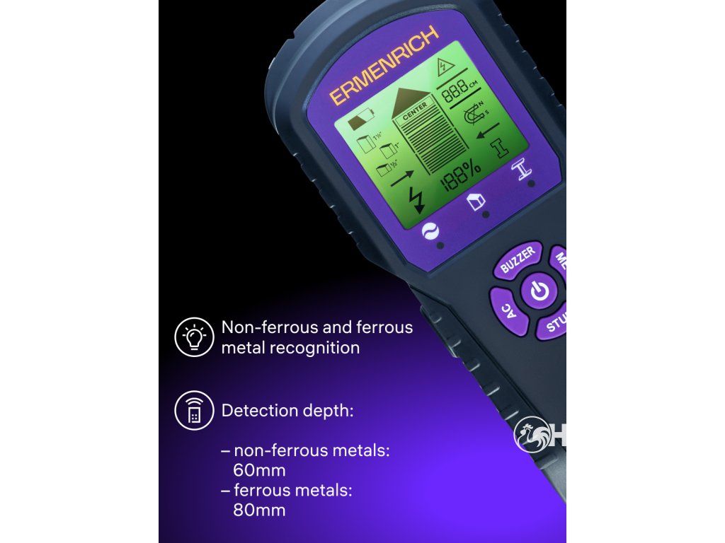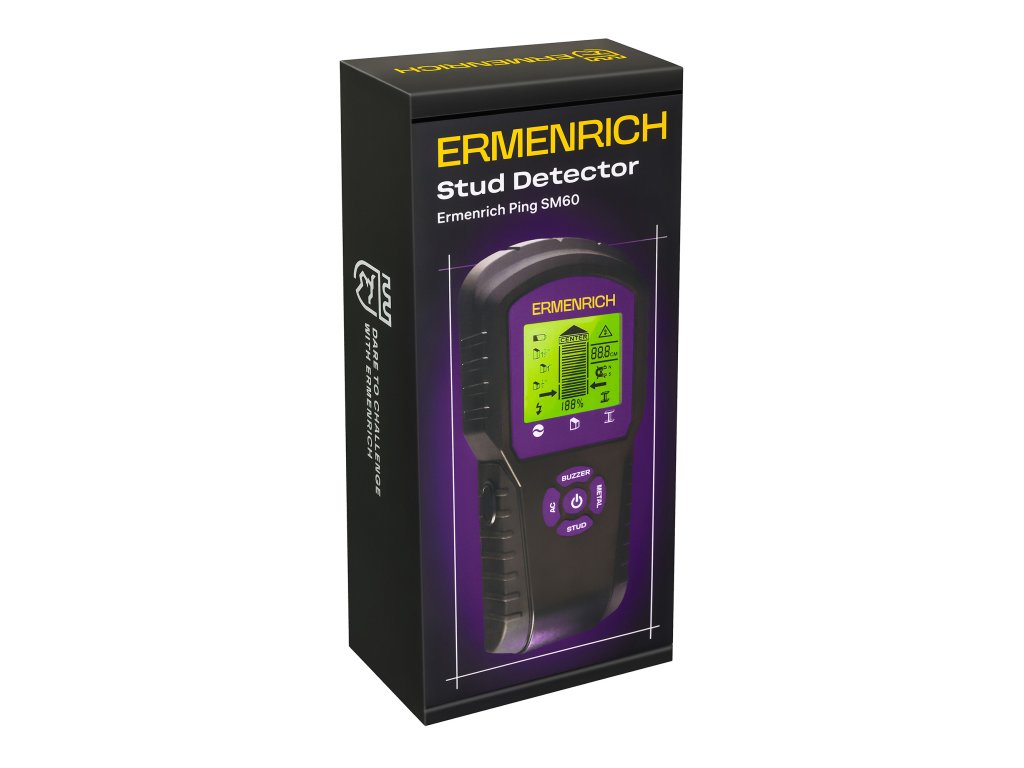 Pomocí stavebního detektoru Ermenrich Ping SM60 můžete snadno a rychle odhalit skryté kabely pod napětím ve stěnách i armatury a další kovové a dřevěné prvky. Přístroj vám pomůže najít nejlepší místo pro vrtání otvorů a usnadní proces vrtání. Stavební detektor je klíčem k úspěšné instalaci zařízení, údržbě objektu a instalaci zásuvek a nábytku. Přístroj je užitečný v každodenním životě i v profesionálním prostředí.