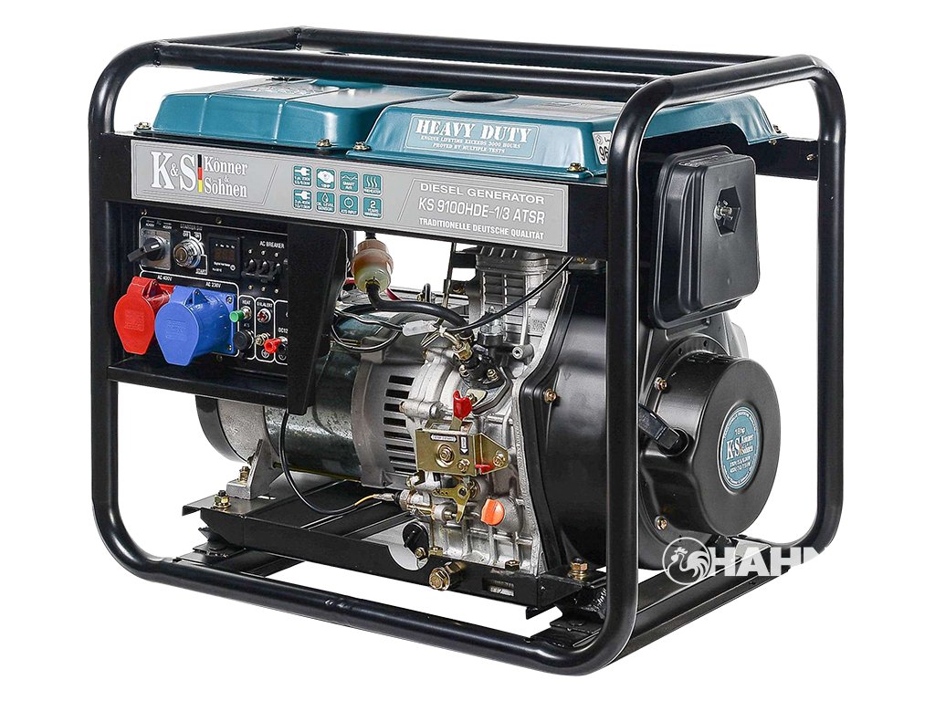 KS 9100HDE 1/3 ATSR (EURO V) je výkonná naftová elektrocentrála řady HEAVY DUTY, která se pyšní robustní zesílenou konstrukcí, jež chrání nádrž před poškozením i během přepravy. Je vybavena výkonným značkovým motorem Könner & Söhnen, který lze použít nejen jako záložní zdroj energie, ale i k nepřetržitému provozu. Mimo jiné je elektrocentrála vybavena předehřívačem, který umožňuje snadné spuštění elektrocentrály i v zimě. Inteligentní stabilizační systém AVR umožňuje udržovat konstantní napětí 230 V a chrání tak elektrocentrálu před nežádoucími zkraty. Tento model je navíc vybaven systémem fázového spínání VTS, díky němuž není potřeba kupovat dvě samostatné elektrocentrály. Tento systém dokáže jednoduše přepínat mezi fázemi - 230 V (jednofázový režim) a 400 V (třífázový režim).