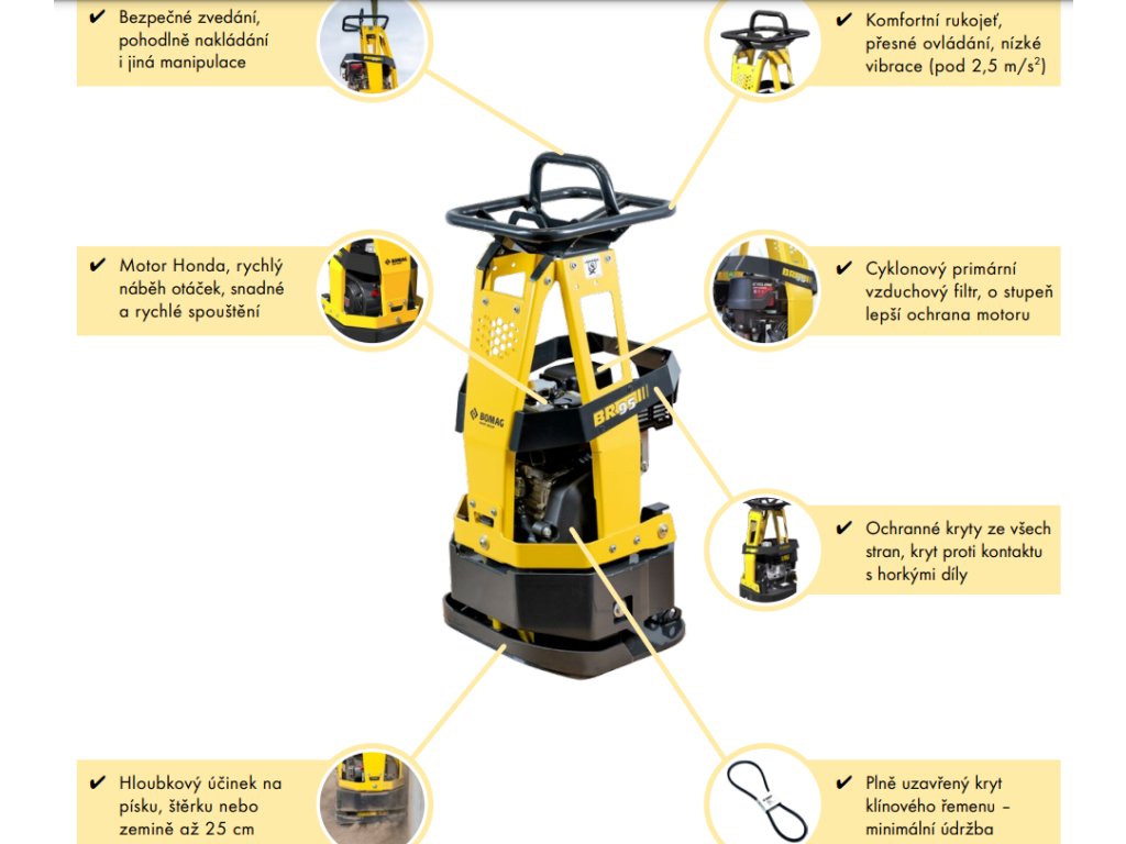 Zajímavá kombinace vibračního pěchu (kompaktní rozměry) a jednosměrné vibrační desky (hutnicí výkon), ideální na práce u zdí, kolem překážek apod.