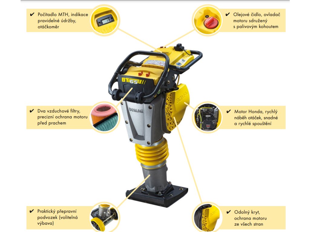 Stroj je konstrukcí chráněn před mechanickým poškozením např. při pádu, motor si sám hlídá hladinu oleje. Zdraví obsluhy chrání velmi nízký přenos vibrací na ruce/paže, manipulaci usnadňuje výborné vyvážení, rolny pro nakládání nebo volitelný přepravní podvozek.