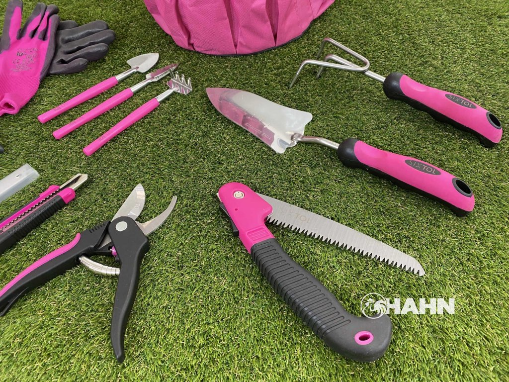 Praktická 10dílná sada zahradního nářadí GARDEN PINK pro každého zahrádkáře. Snadný přenos nářadí v brašně s kapsami a vodotěsným vnitřkem, který poslouží i jako kýbl na vodu, hlínu, odpad ze záhonu nebo cokoli dalšího. Součástí sady jsou také zahradní rukavice a čtyři plastové „drápy“, se kterými je možné snadno vydloubnout plevel z hlíny nebo vyhrabat důlek v záhonu. „Drápy“ chrání vaše nehty a prsty před poraněním o ostré kamínky a jiné ostré a tvrdé předměty v hlíně.